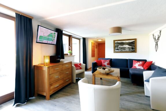 ländlich eingerichtete Wohnzimmer mit gemütliche Sitzecke, Couch, 3 Sessel, Flatscreen-TV
