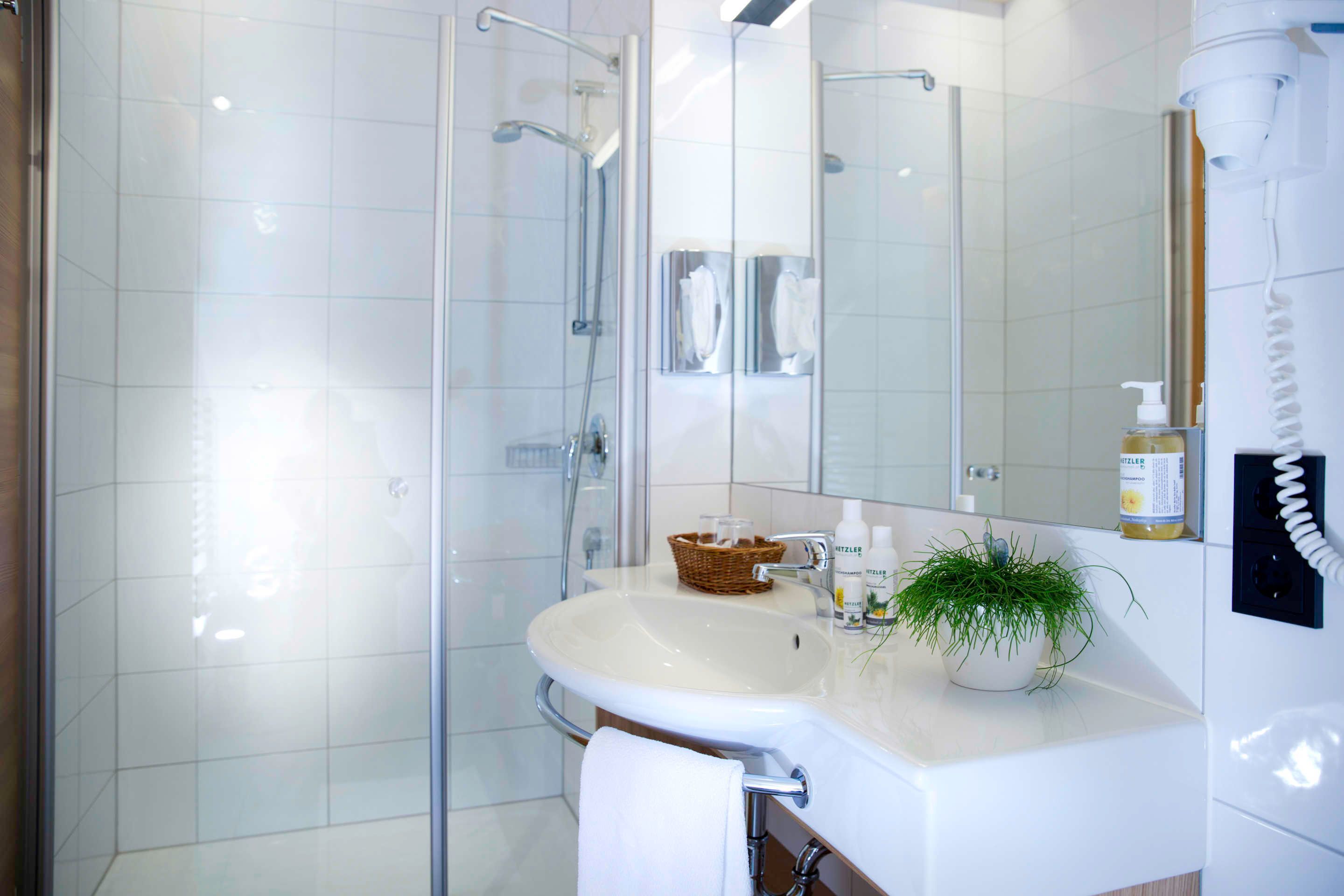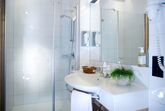 • Die Badezimmer sind ausgestattet mit großen Waschtischen, Dusche, WC, Schminkspiegel, Fön …
