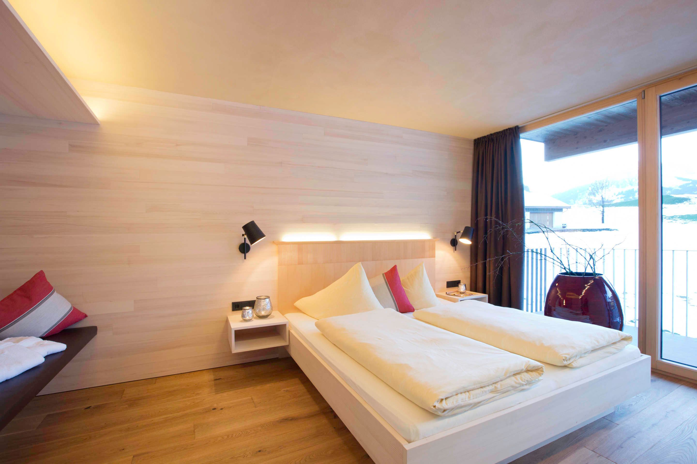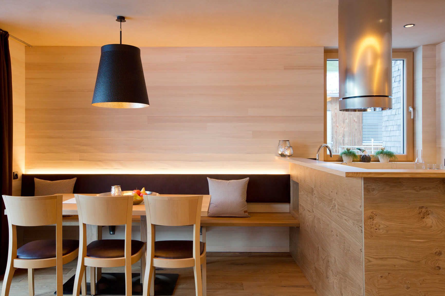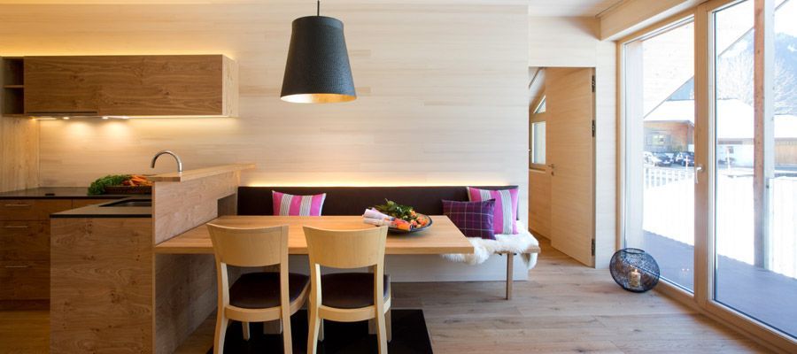 Alle Apartments sind mit hochwertigen Holzböden (Eiche Parkett), Wandvertäfelungen aus heimischer Weißtanne, Decken aus heimischer Weißtanne und Lehmputz ausgestattet.
