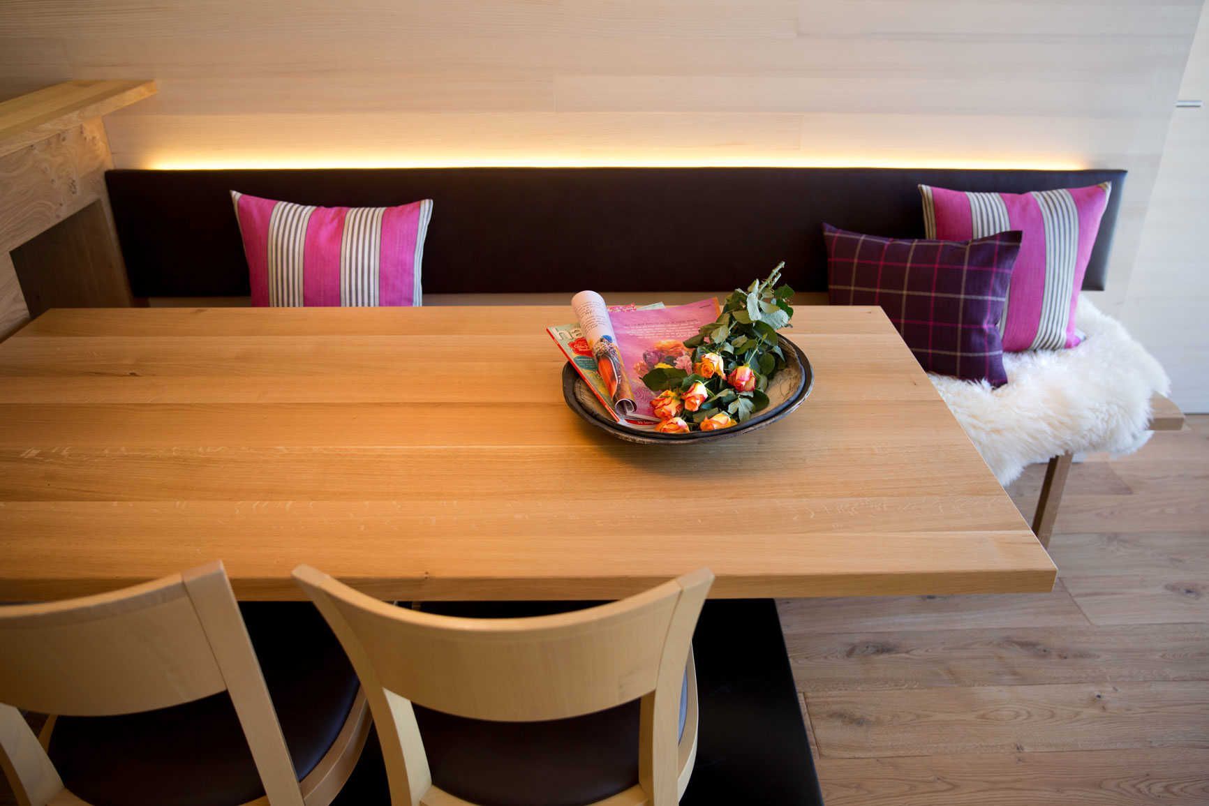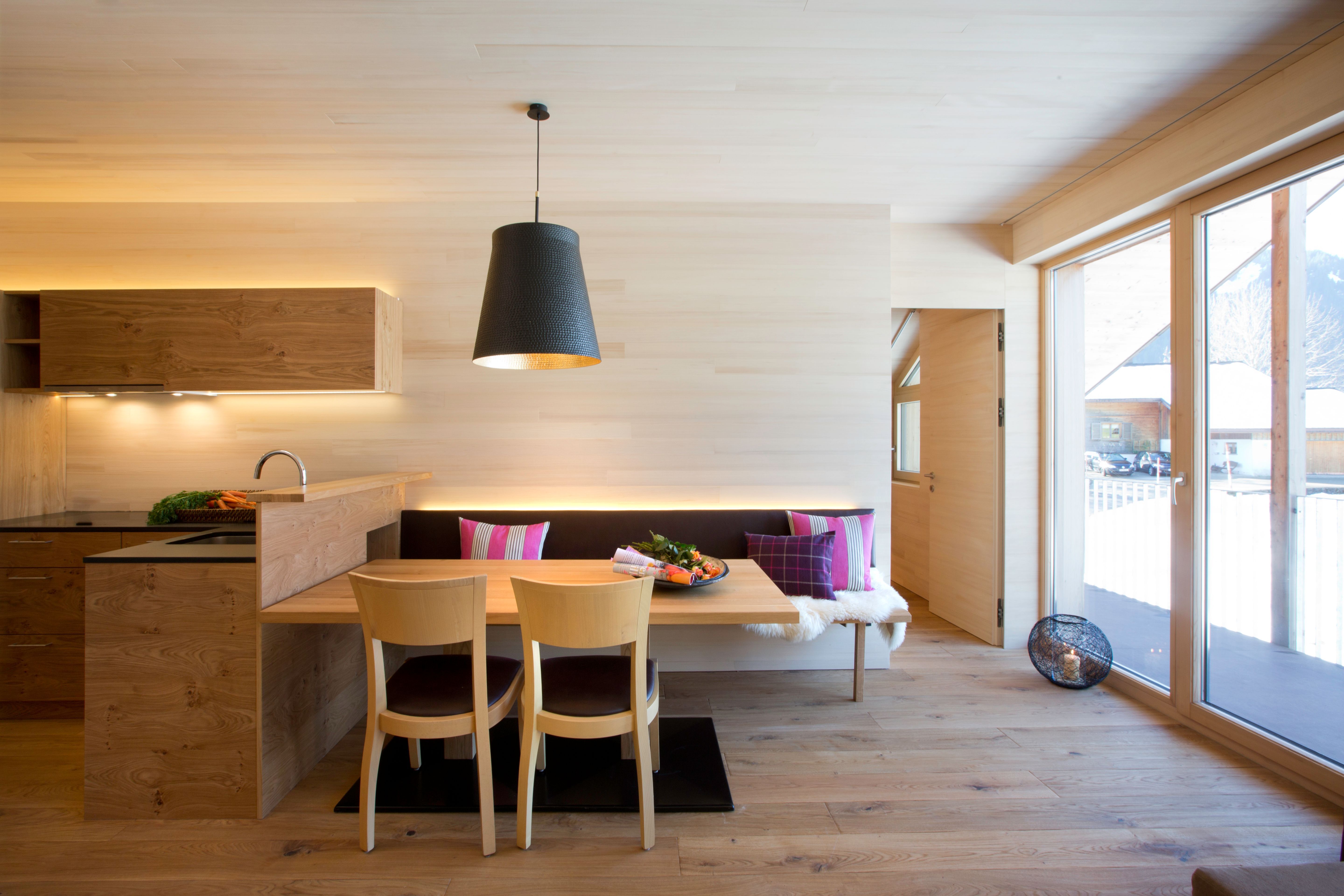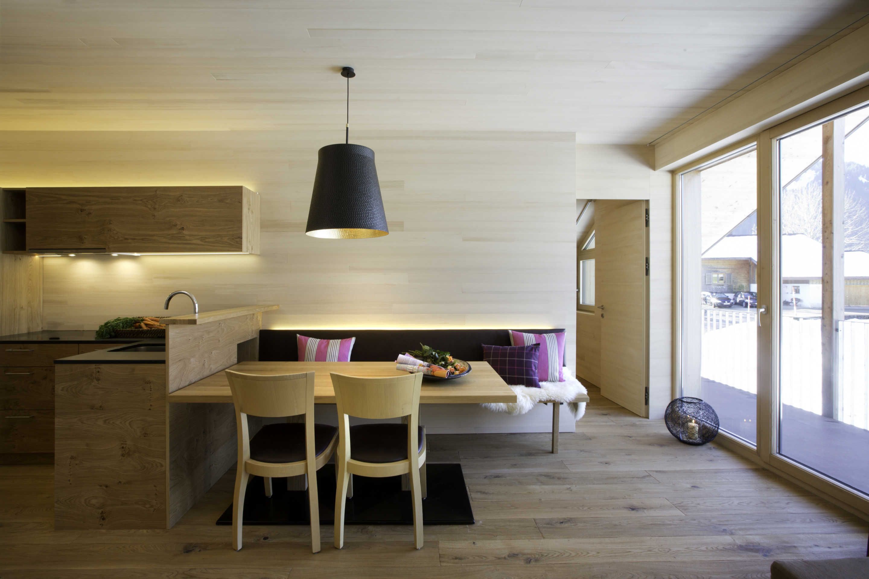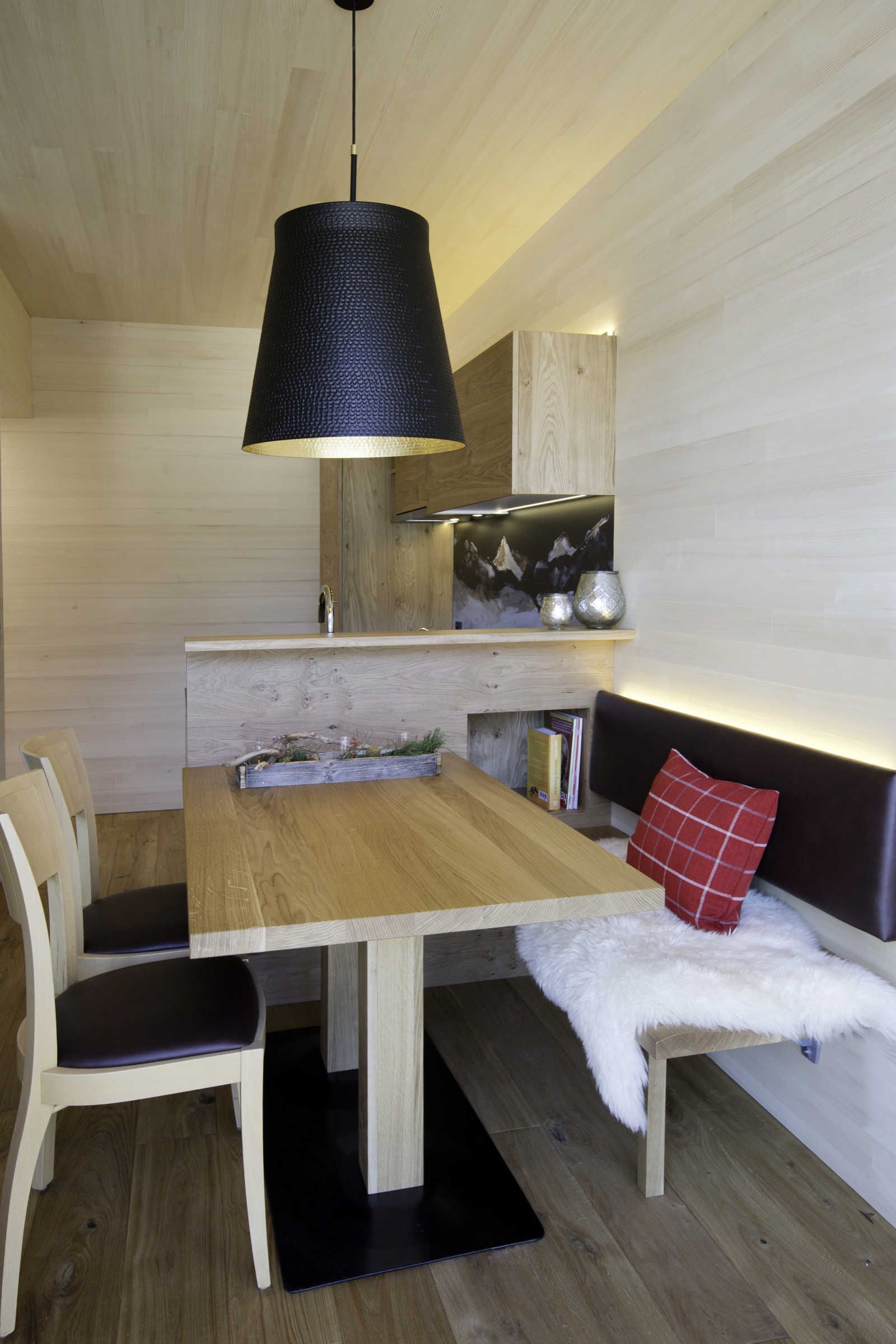 Alle Apartments sind mit hochwertigen Holzböden (Eiche Parkett), Wandvertäfelungen aus heimischer Weißtanne, Decken aus heimischer Weißtanne und Lehmputz ausgestattet.
