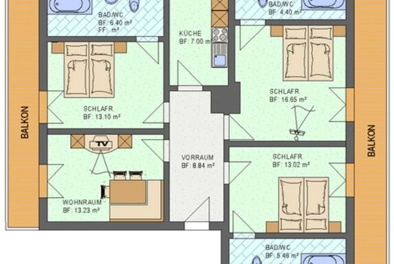 getrennte Schlafzimmer mit je einem Bad/WC, einer Küche und einem