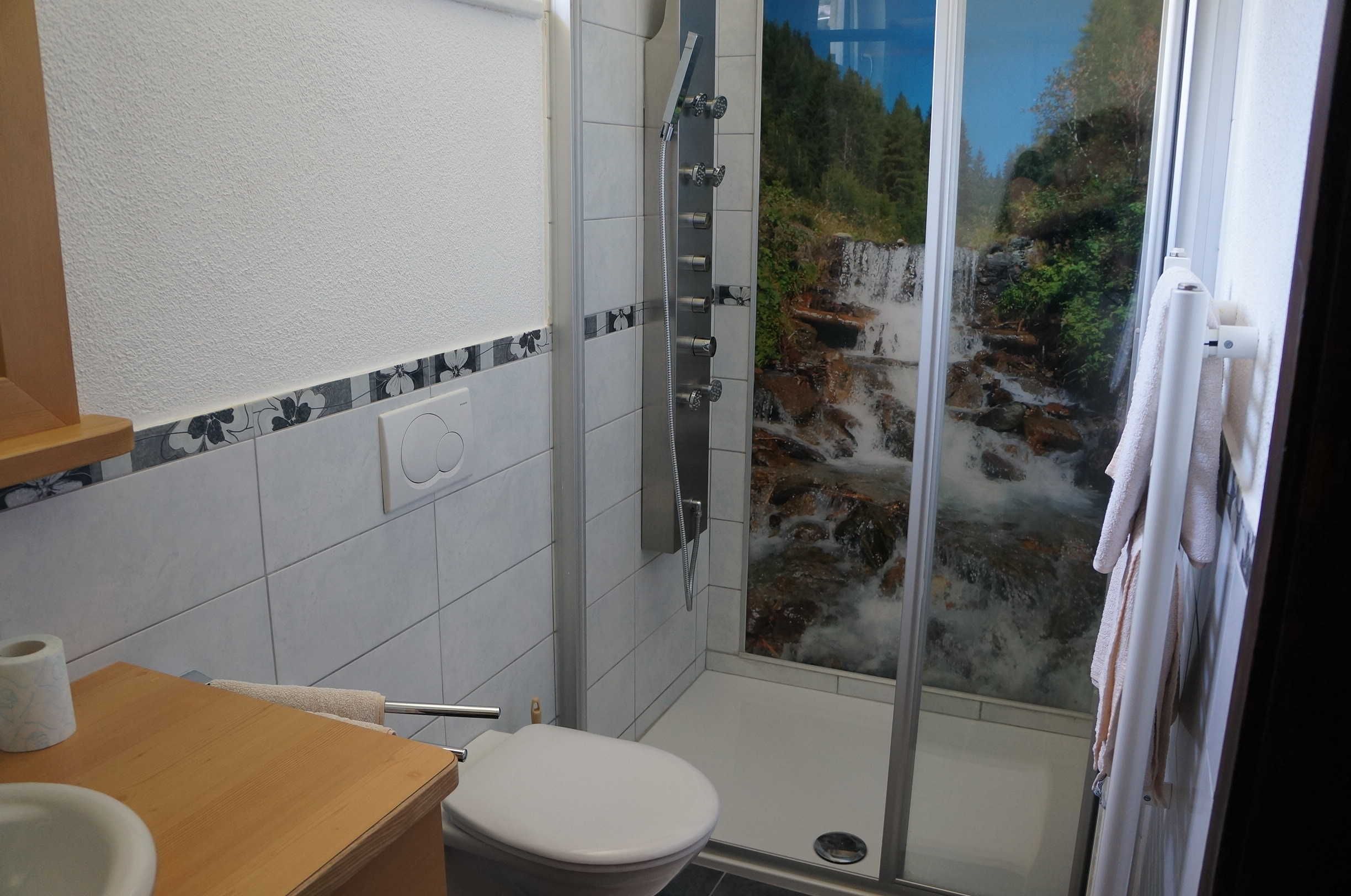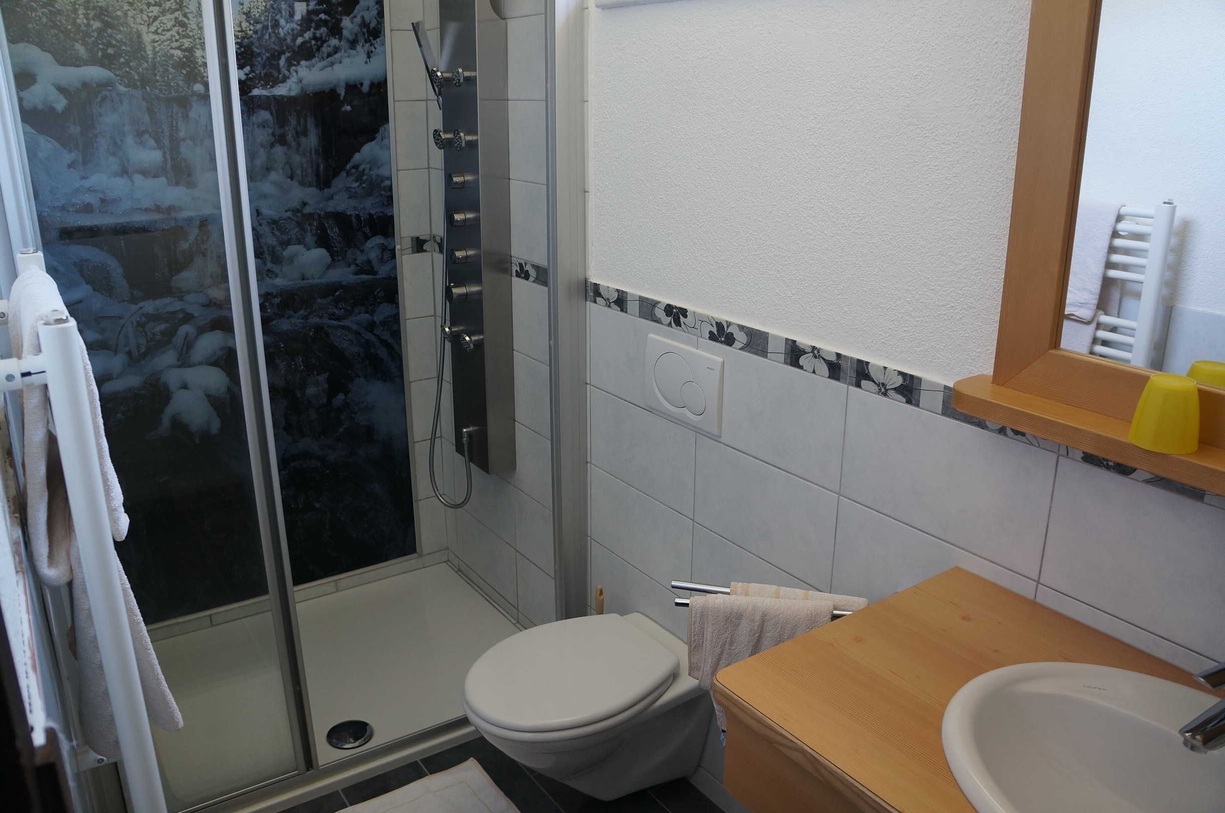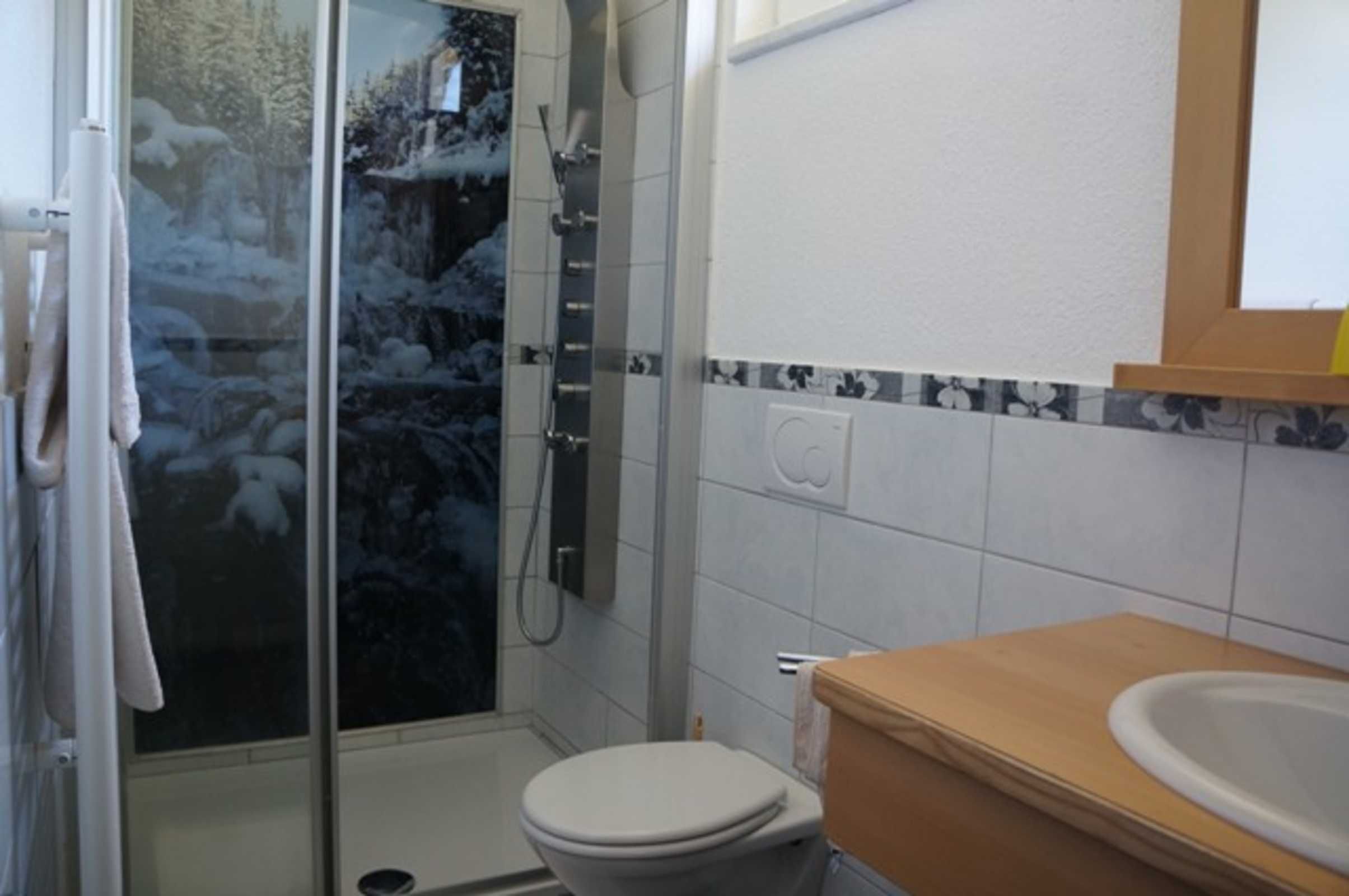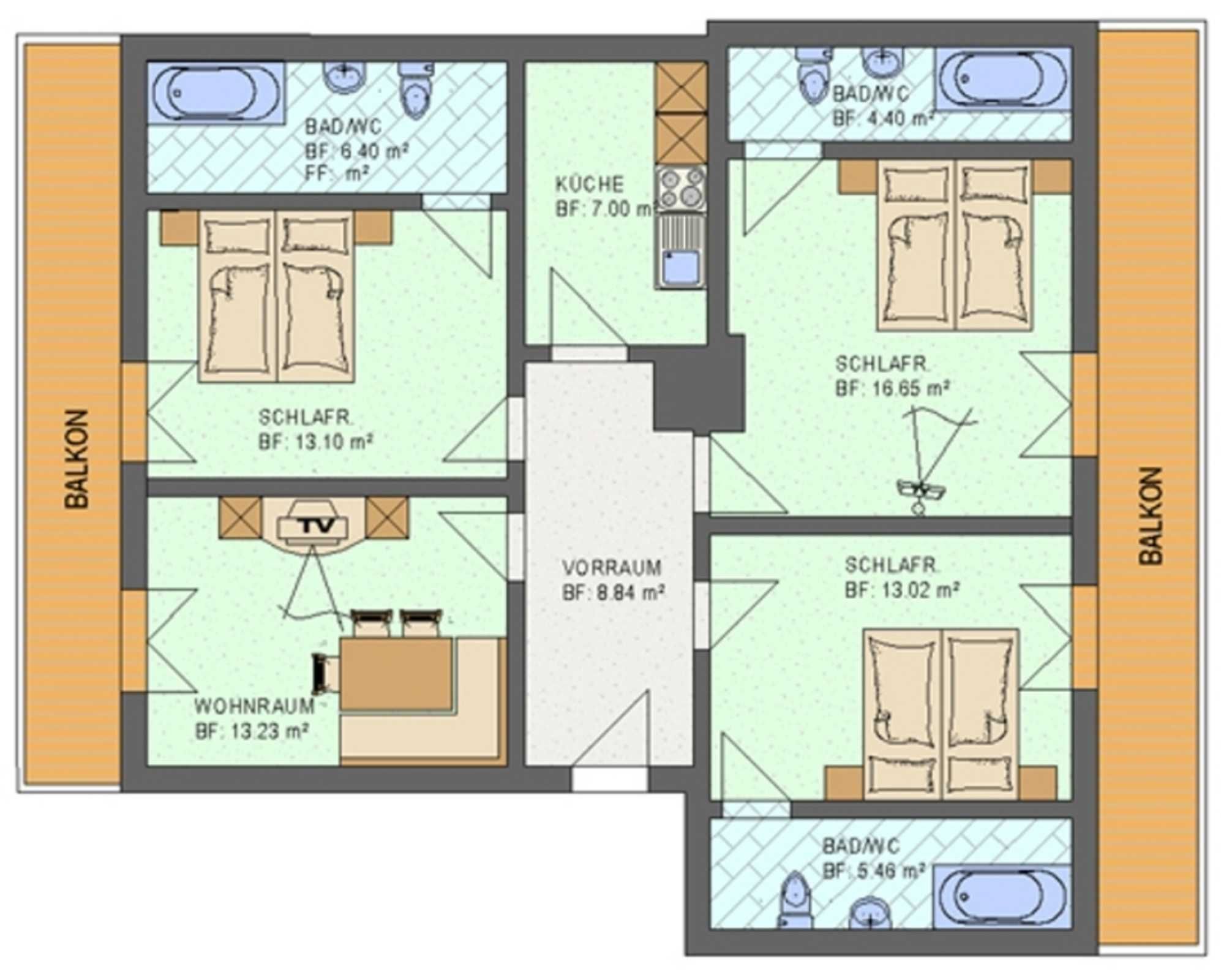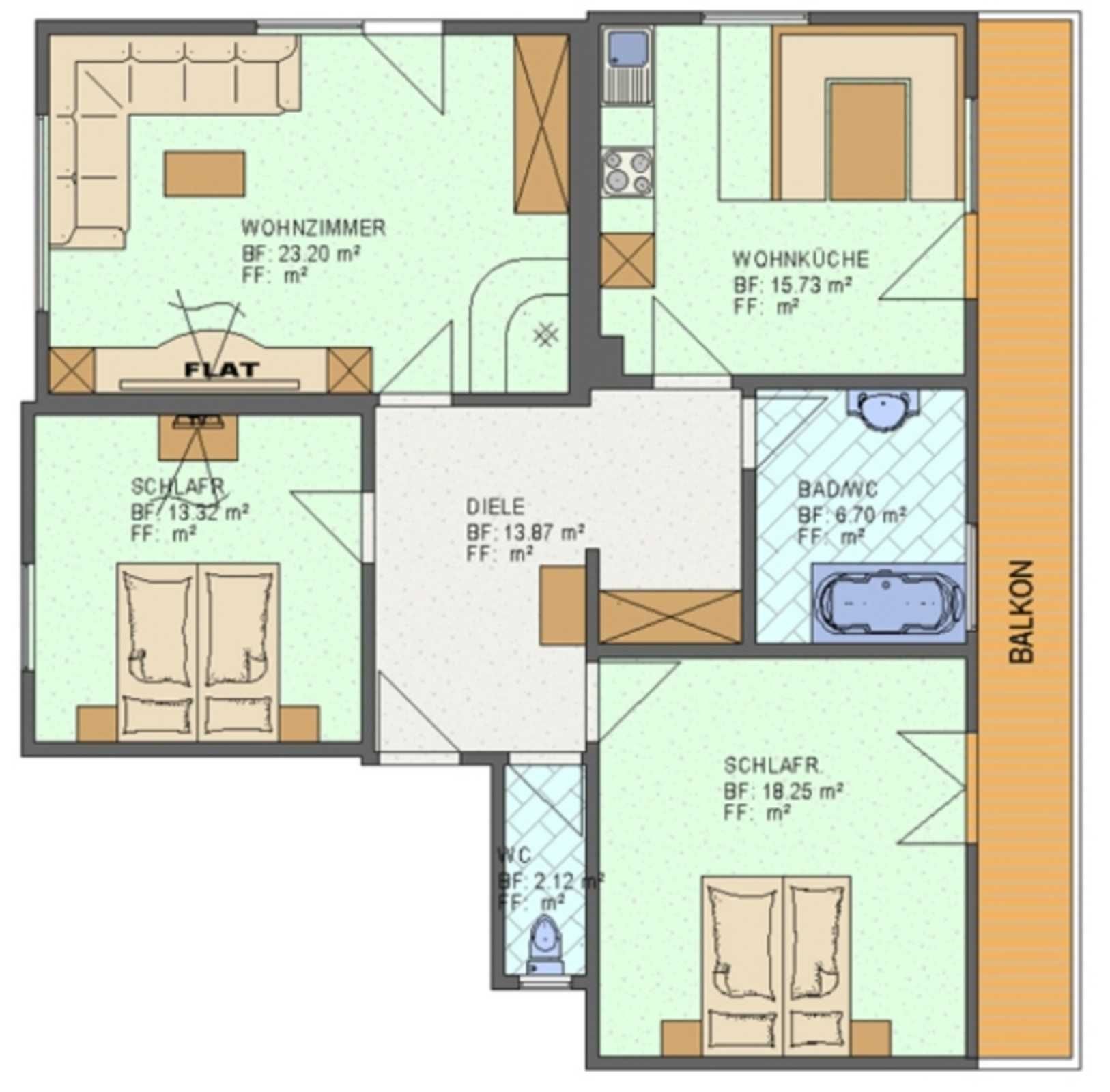 Drei getrennte Schlafzimmer mit je einem Bad/WC, eine Küche und einem separates Wohnzimmer mit Sat-TV, Südbalkon sowie Garagenplatz.