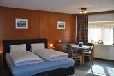 Wohn-Schlafraum mit französischem Bett, Küchenzeile mit Kühlschrank und Backofen, gemütliche Sitz-Essecke, FLAT- SAT-TV, Bad/Dusche/WC, eigener Eingang, ebenerdig im Anbau.