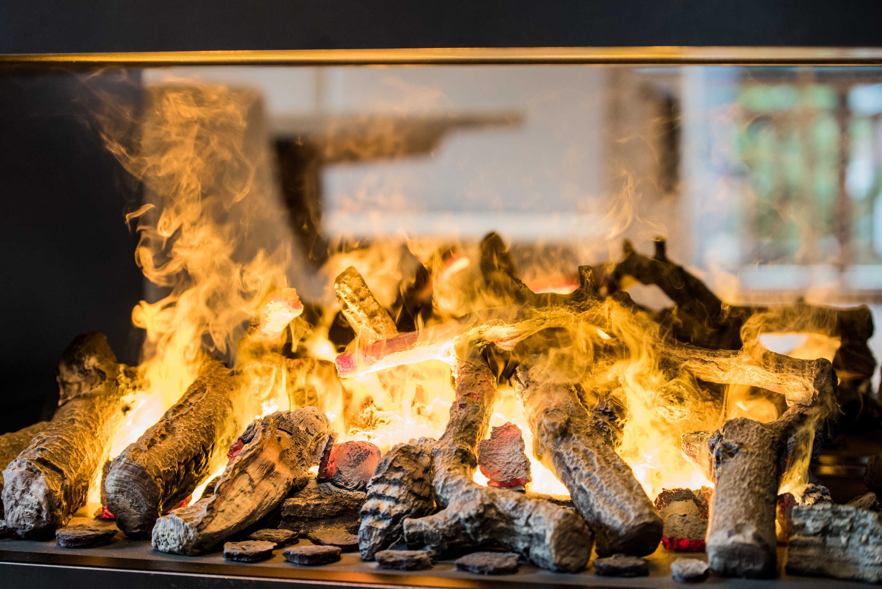 gemütlichen Wohnbereich mit Aquaflame Kamin, Esstisch, Ausziehcouch mit 3 Schlaf Möglichkeiten, eine voll ausgestattete Küche mit Spülmaschine und einer Nespresso Kaffeemaschine, Balkon, W-Lan, LED TV,