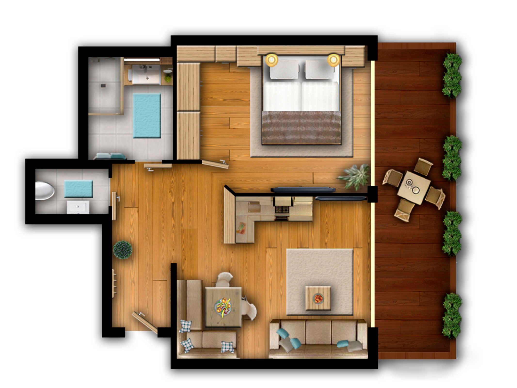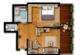ca. 39 m², 1 Schlafzimmer (Boxspringbett 180x200), gemütlicher Wohnbereich, Esstisch, Ausziehcouch mit 2 Schlaf
