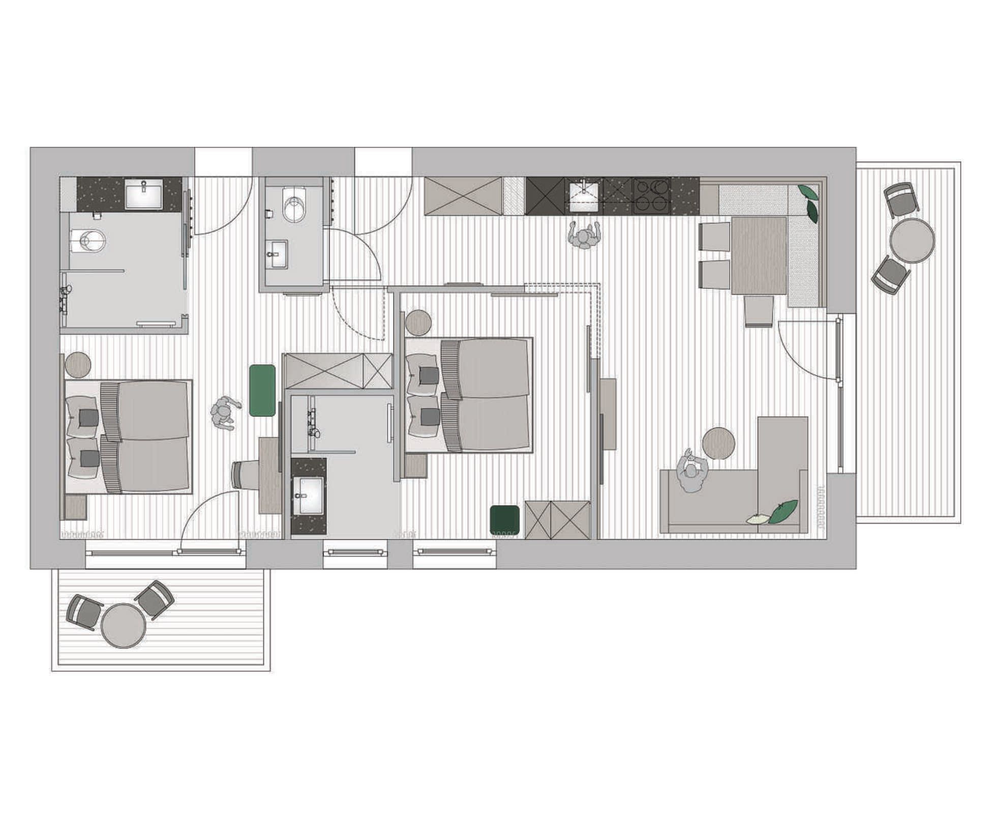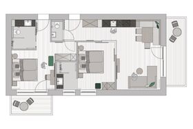 65 Quadratmeter für 4-6 Personen bestehend aus einem Appartement mit 2 Doppelzimmer. 2 Schlafzimmer mit je einem Doppelbett und 1 Schlafsofa für 2 Personen. 2 Badezimmer mit Dusche und WC, TV inkl. Flatscreen, Radio, free Wifi, Doppelbett (Kingsize), Balkon. Ausziehbare Couch, Küche mit Geschirrspüler, Mikrowelle und Nespresso Kaffemaschine, Kühlschrank, Wohnbereich mit Essecke.