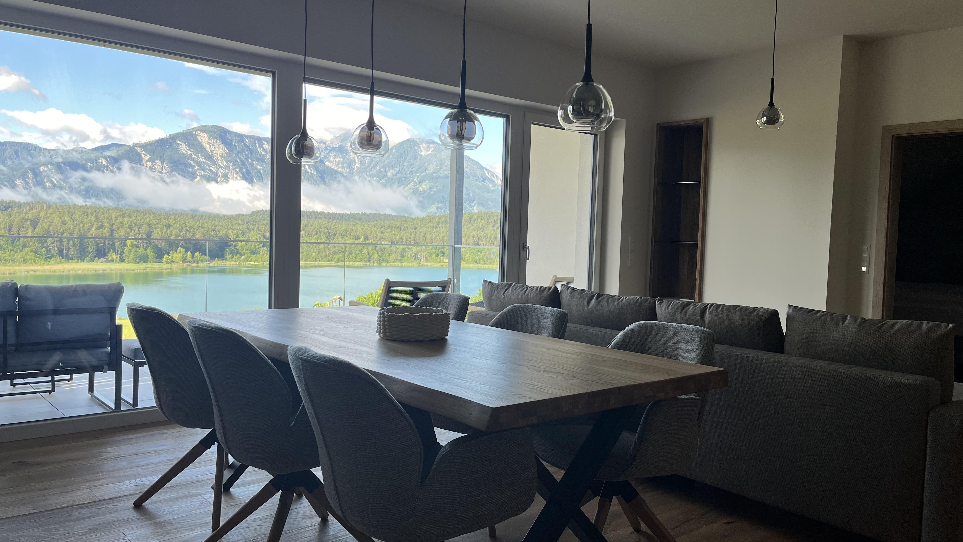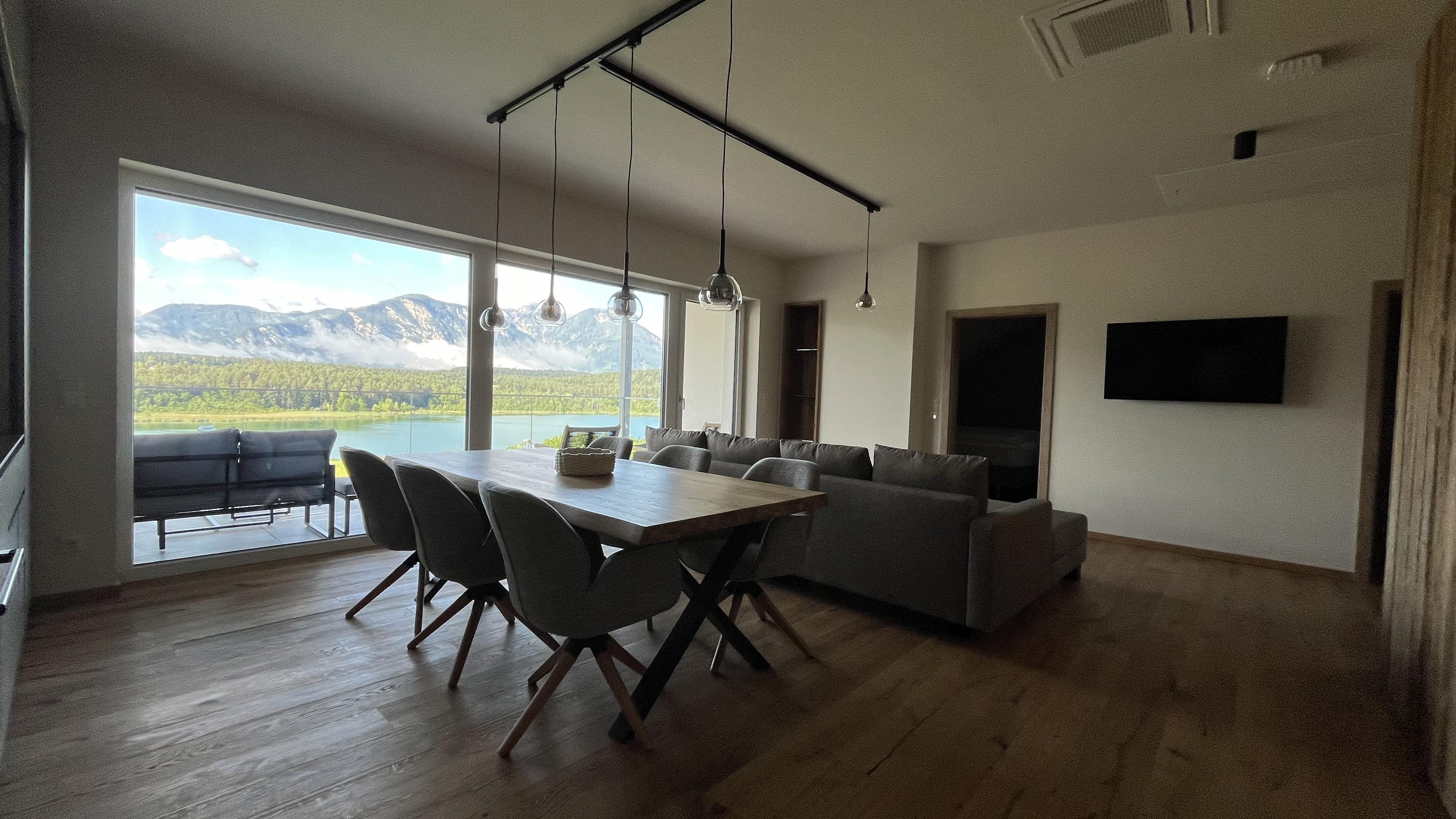 Der Wohnraum besticht mit seiner großen Glasfront, die direkt auf die Terrasse führt. Im Wohnraum befindet sich eine moderne Küche, ausgestattet mit Kühlschrank, Gefrierfach, Ceranfeld, Backrohr, Geschirrspüler, Spüle, Kaffeemaschine und Wasserkocher. Die Küche enthält ein vollständiges Besteck- und Geschirrservice. Der Esstisch, für bis zu 6 Personen, ermöglicht einen einzigartigen Ausblick auf den See während dem Essen. Zum Entspannen lädt die große Couch mit Fernseher ein. Bei mehr als 5 Personen, findet eine weitere Person auf der gemütlichen Ausziehcouch Platz.