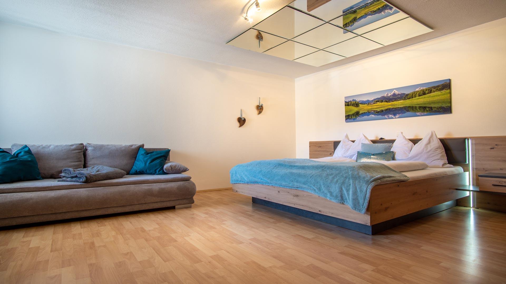 1 großes Schlafzimmer mit Doppelbett sowie ein Doppelbett in der großen Wohnküche