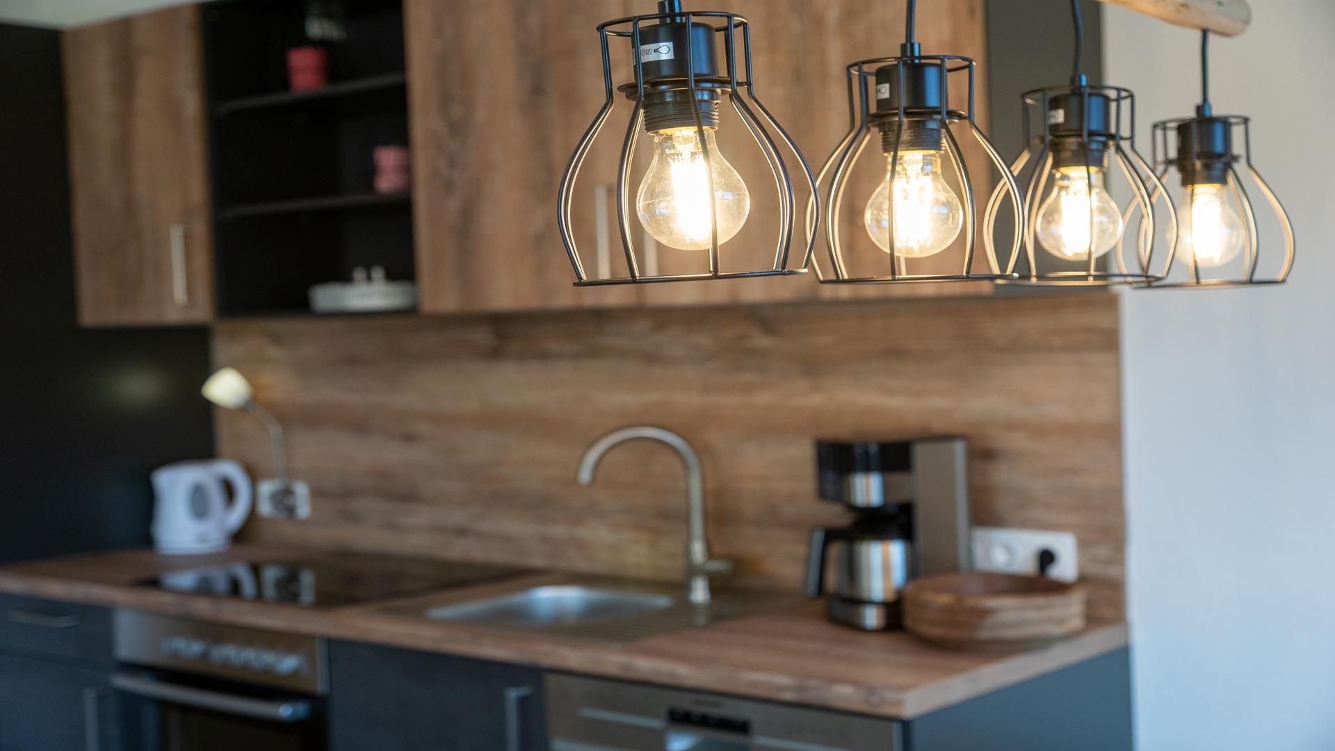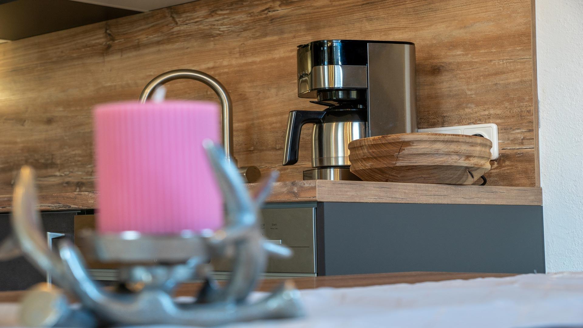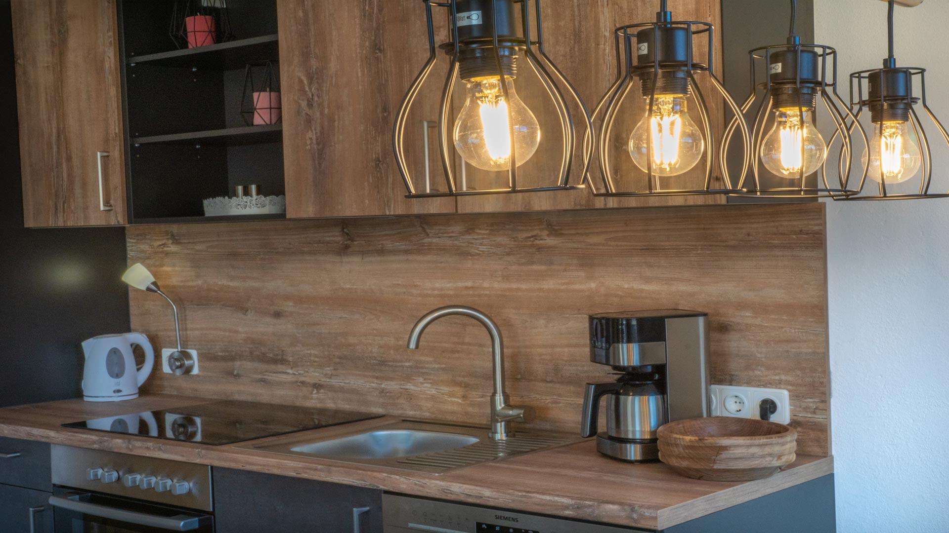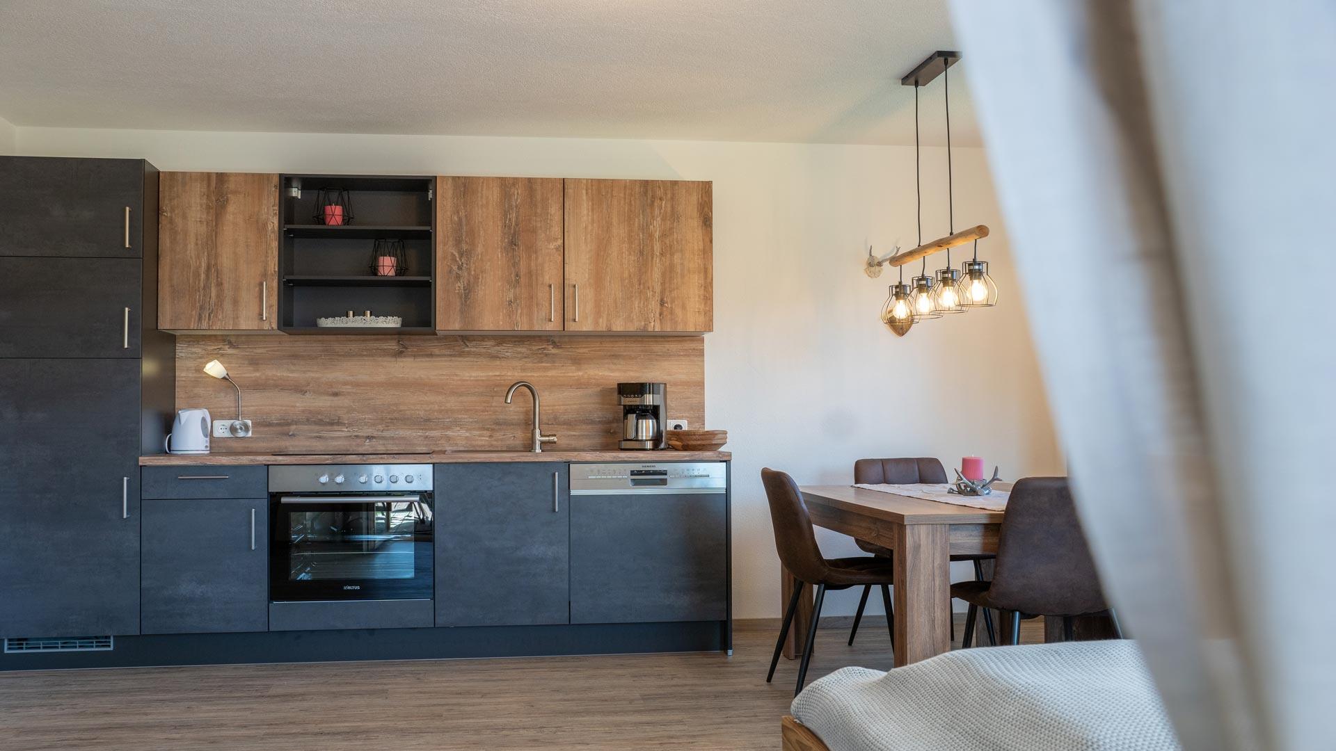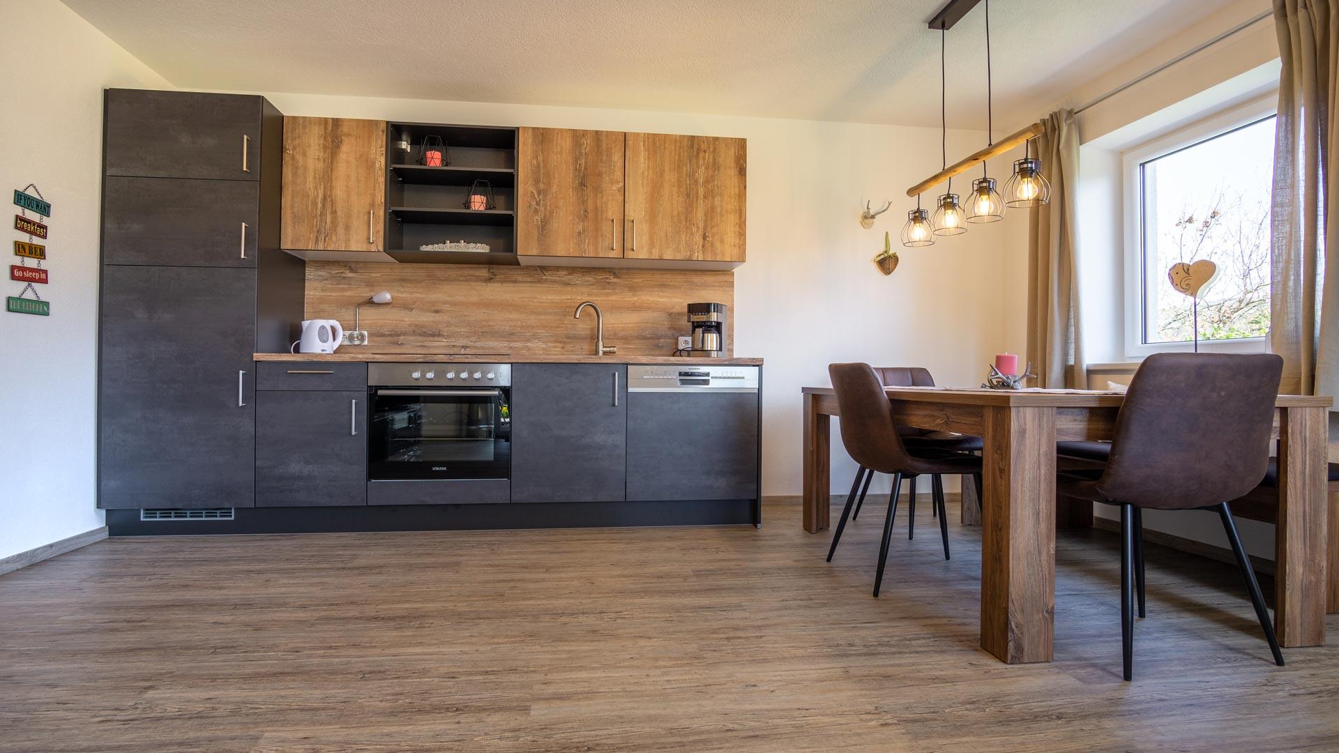 Gemütlich eingerichtete Wohnküche mit SAT-TV, Radio, Backofen, Geschirrspüler, Kühlschrank mit Gefrierfach, Kaffeemaschine, elektr. Wasserkocher, Toaster, genügend Kochutensilien und Geschirr