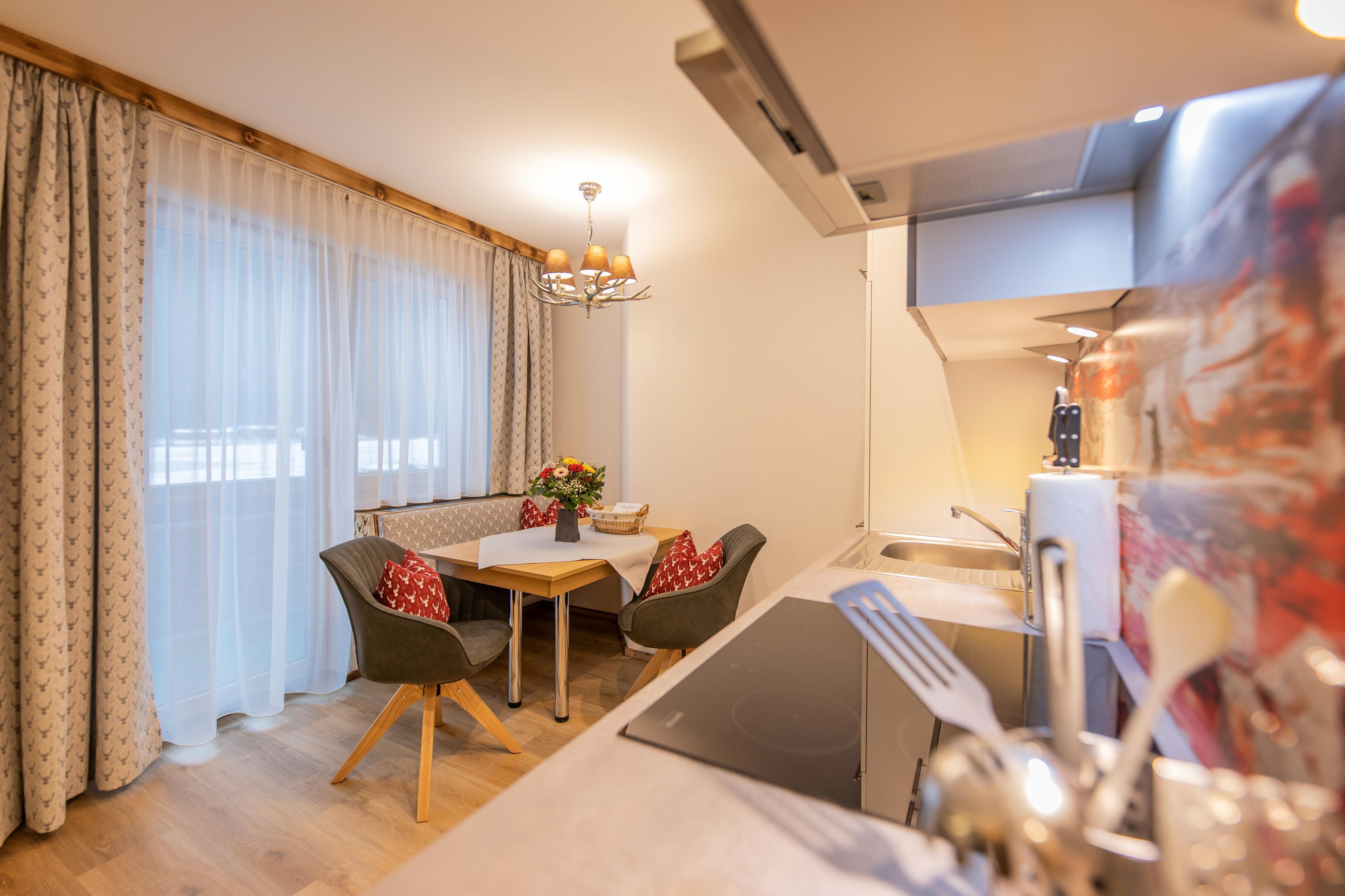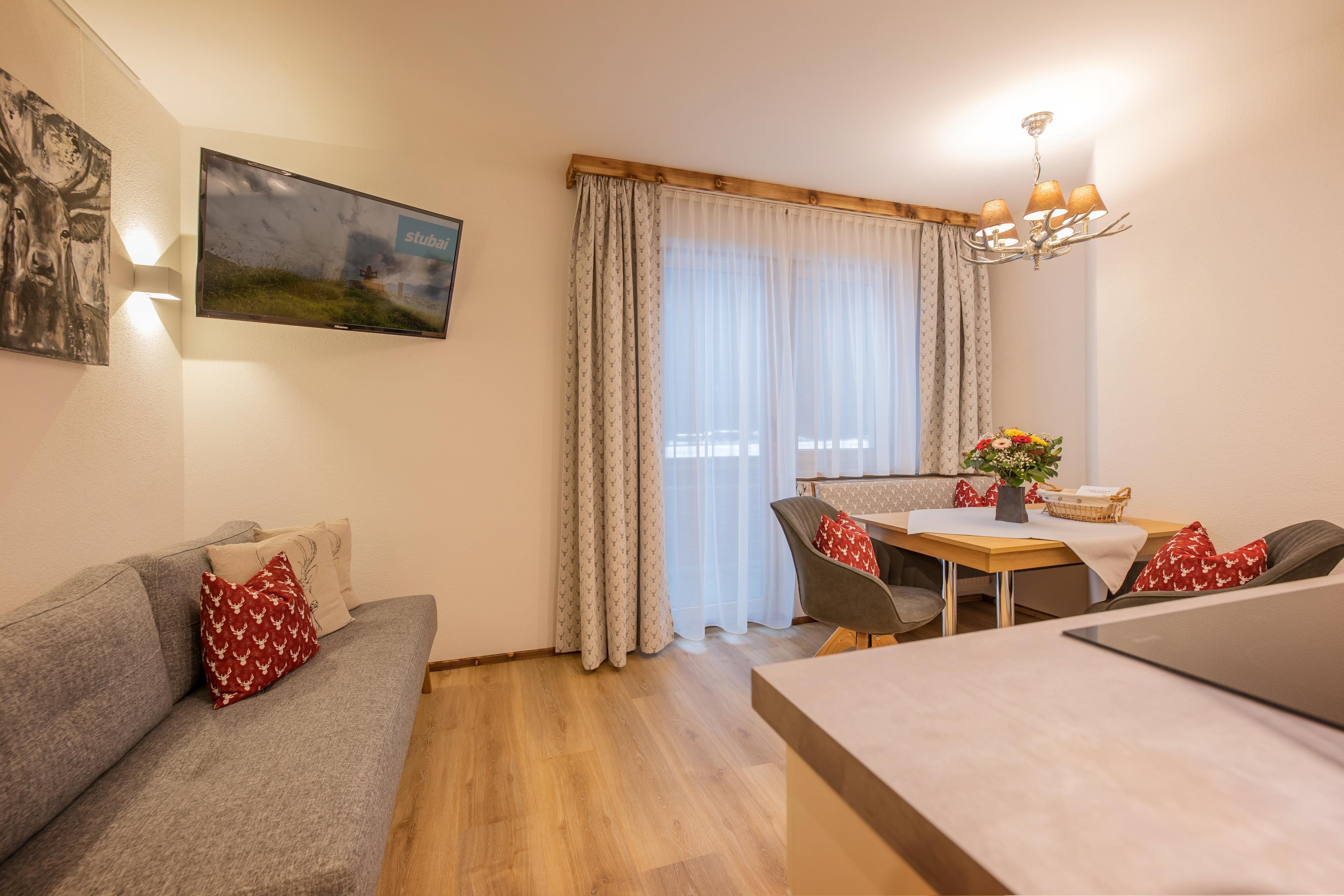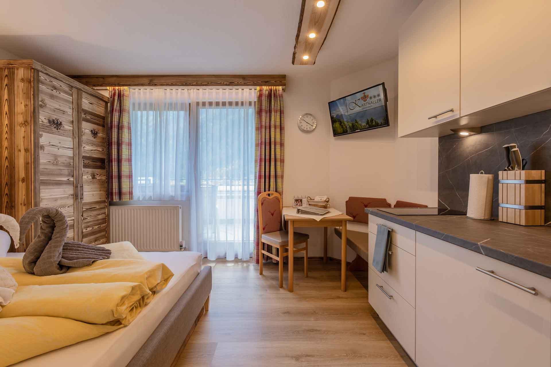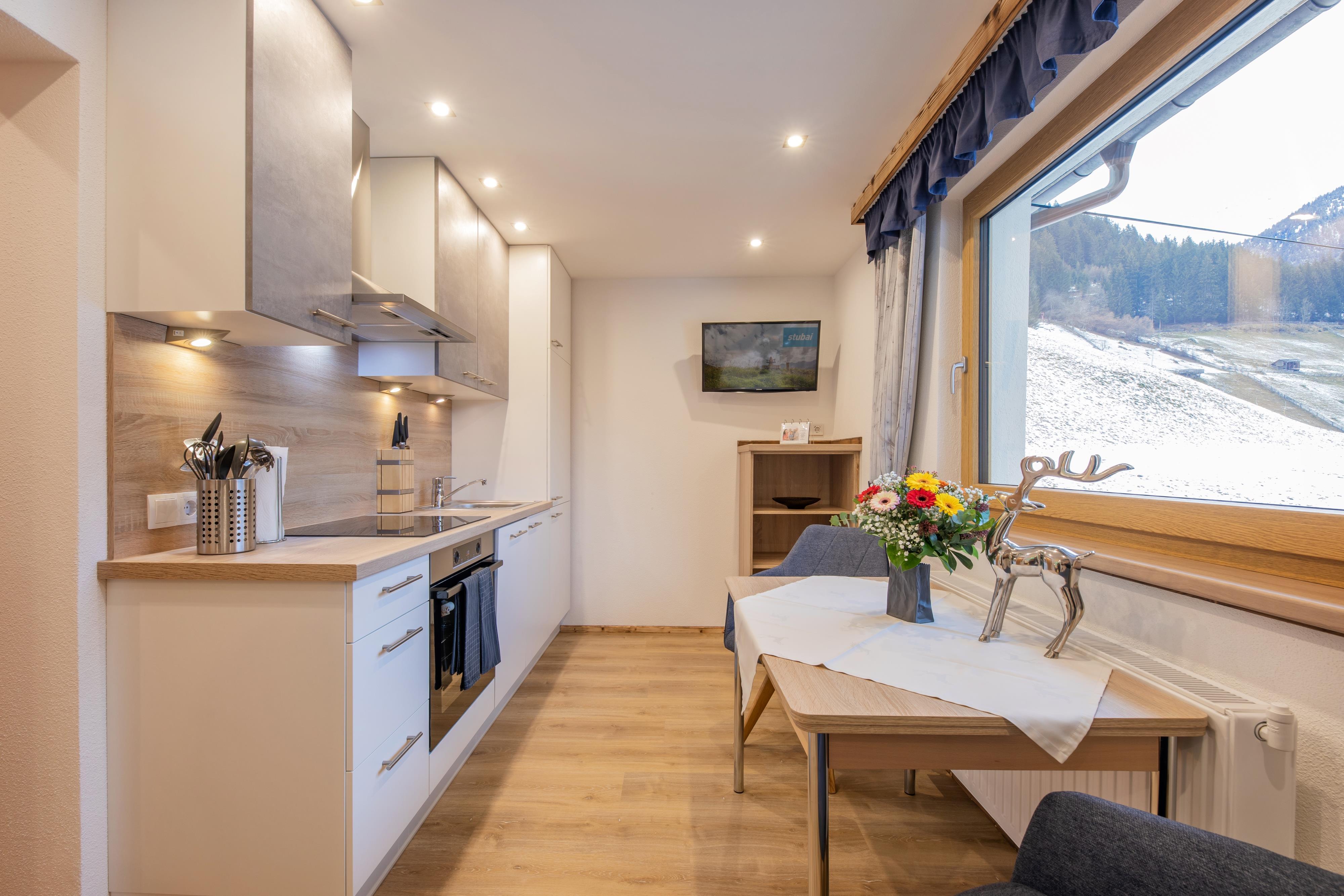 Unsere nigel-nagel-neue Ferienwohnung 1 im vierten Stock des Gästehauses Kartnaller ist mit ihren 40 m² speziell für Pärchen und kleine Familien geeignet. Auf dem großen Süd-/Westbalkon geniessen Sie ungestört die Sonne!
