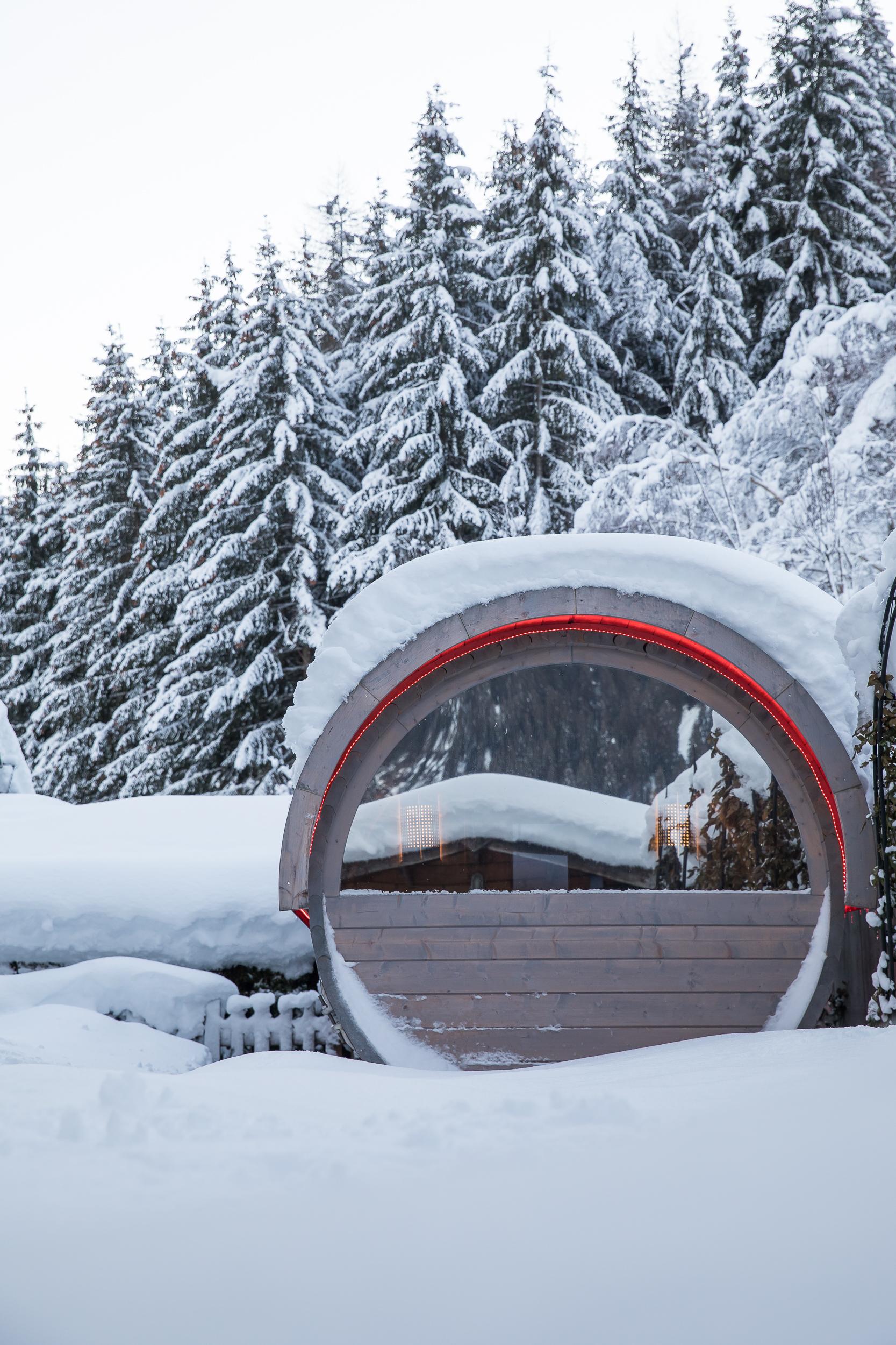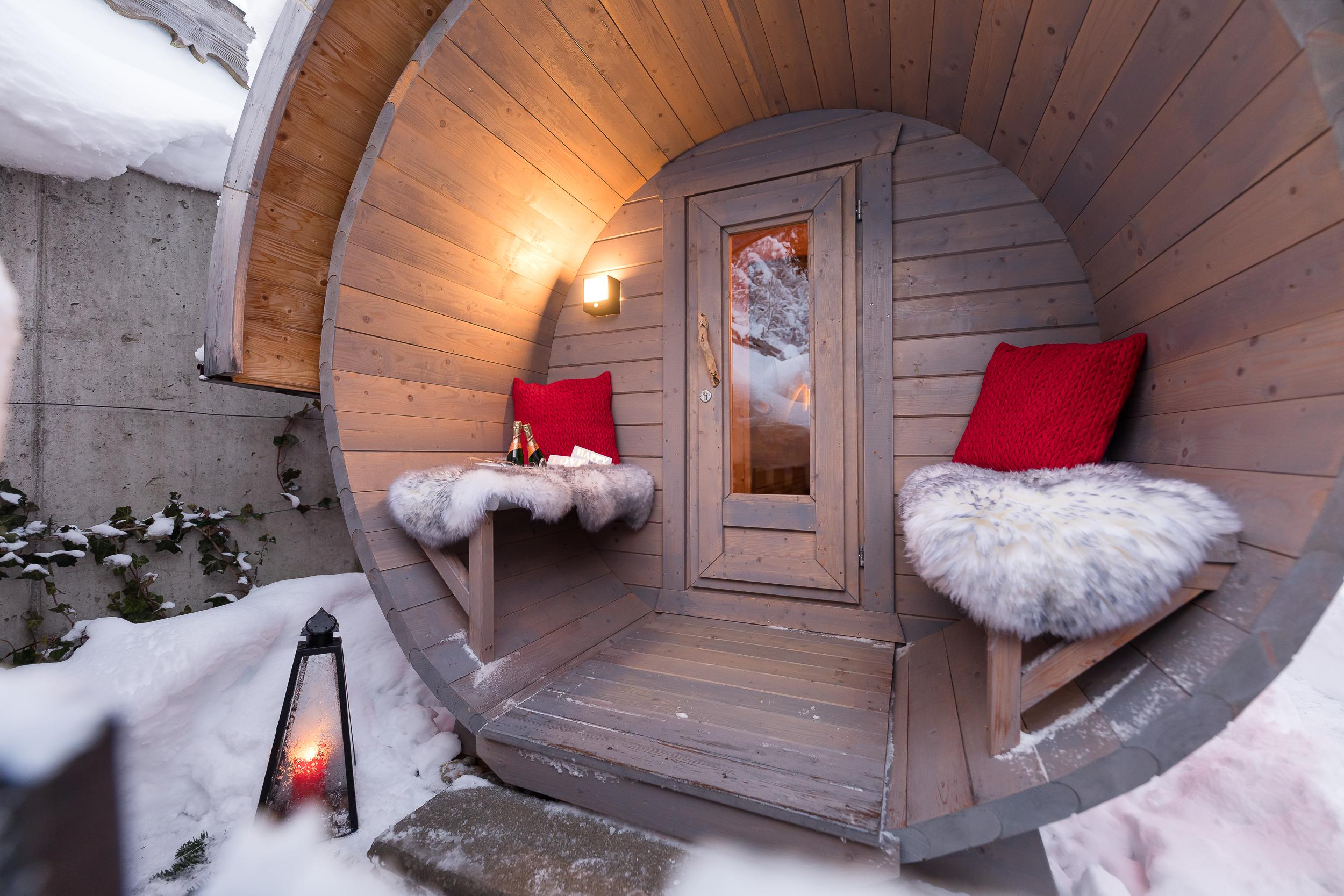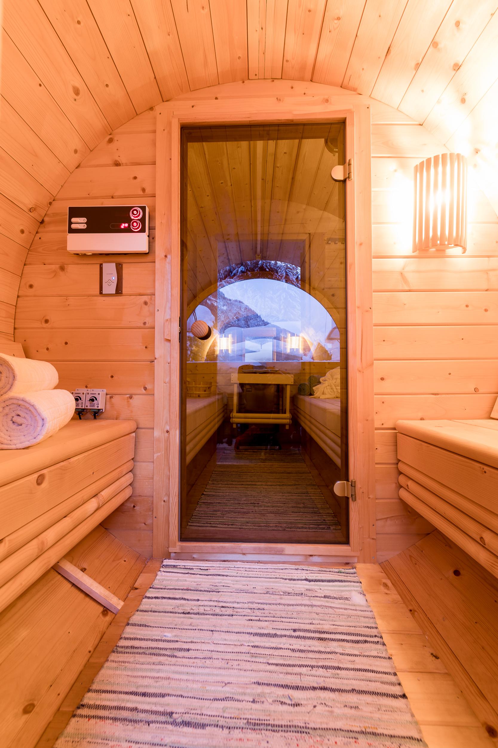 Wellnessen ganz privat und originell: im exklusiven Saunafass mit Blick auf die atemberaubende Stubaier Bergwelt.