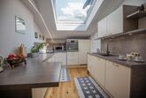 *eine Küche mit Dachfenster, Kühlschrank, Herd, Backofen, Spülmaschine, Mikrowelle, uvm.,..