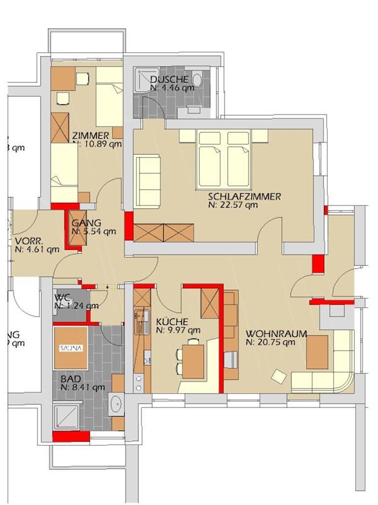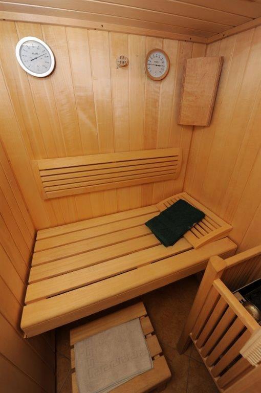 Ausstattung der Wohnung: Vorraum, Wohnzimmer, zwei Schlafzimmer mit Dusche/WC, ein WC getrennt, Küche eigener Raum, W-Lan und SAT-TV. Der Luxus in der Wohnung ist natürlich die eigene Sauna mit Infrarot, Dampfsauna und finnische Sauna, sowie der elektrische Kachelofen.