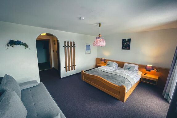 Ein großes Zimmer in dem bis zu 4 Personen schlafen können. Doppelbett und zusätzlicher Couch, Dusche/WC, Balkon, Telefon, SAT-TV, CD-Radio, Mini-Kühlschrank, Safe und Internet (WLAN).