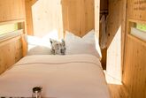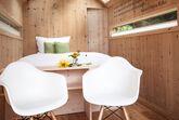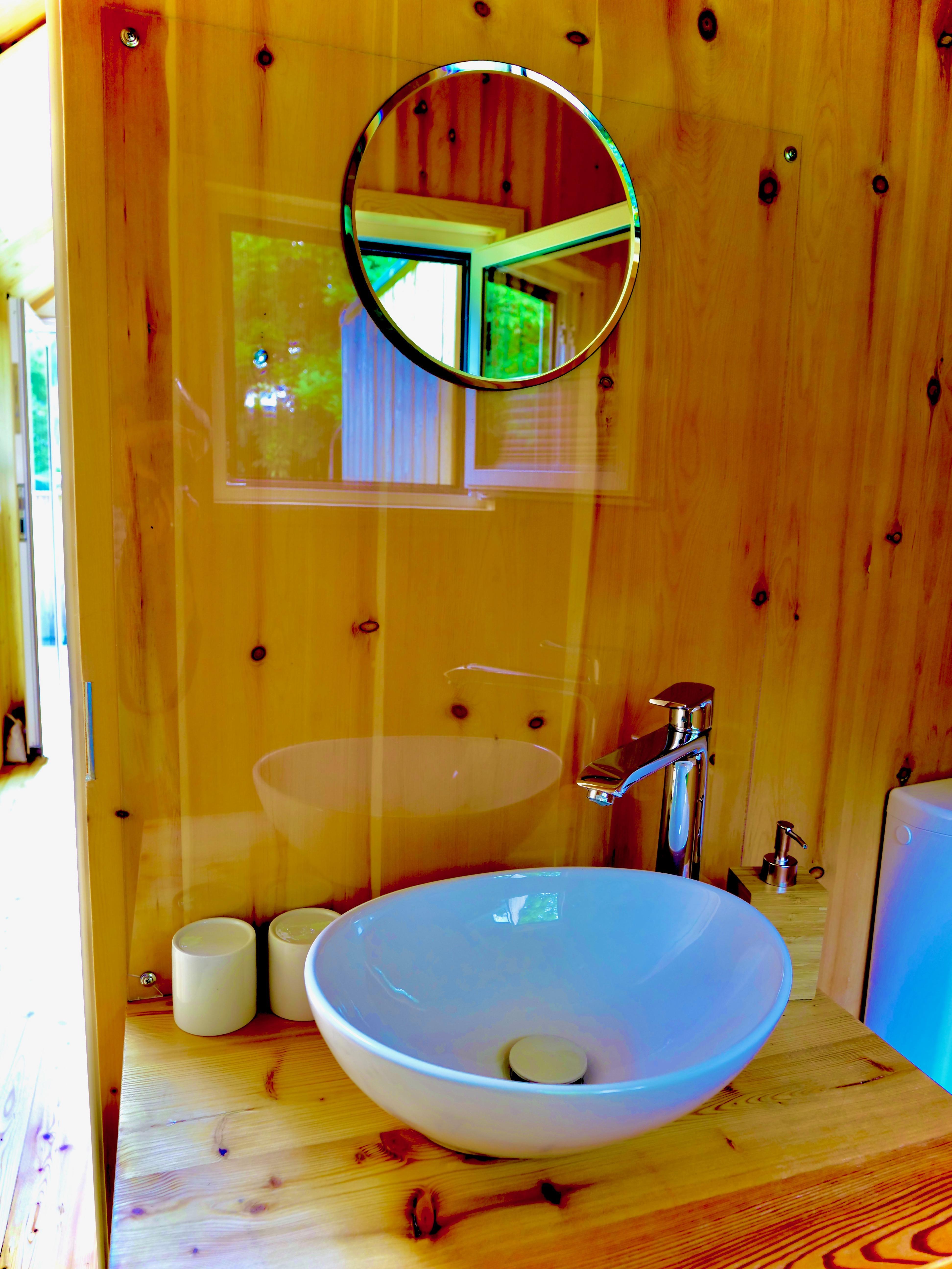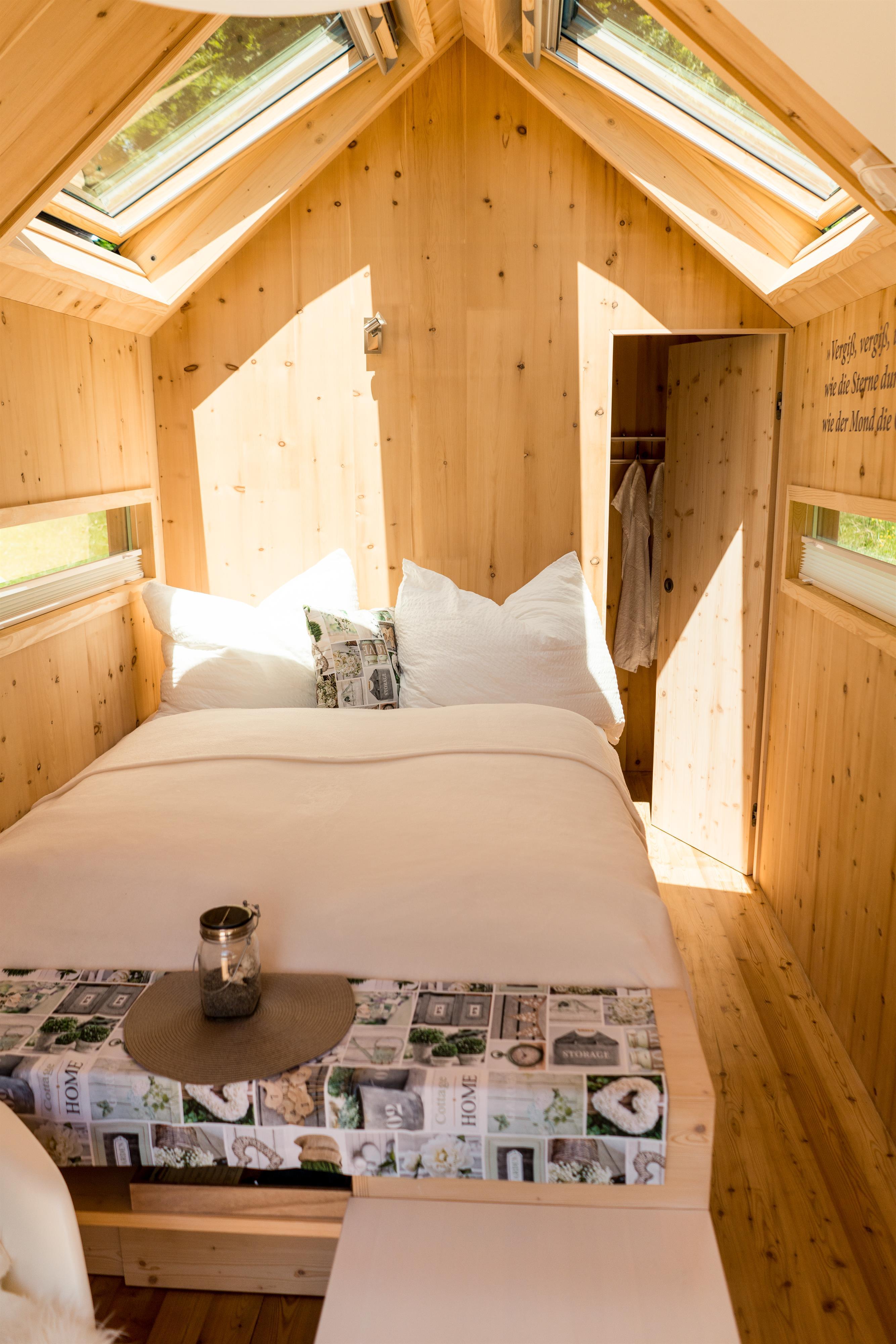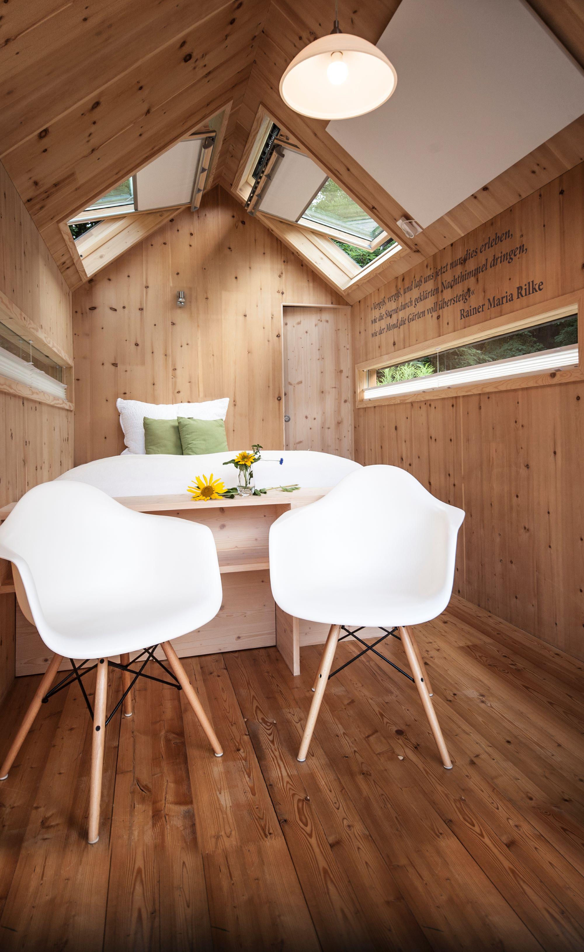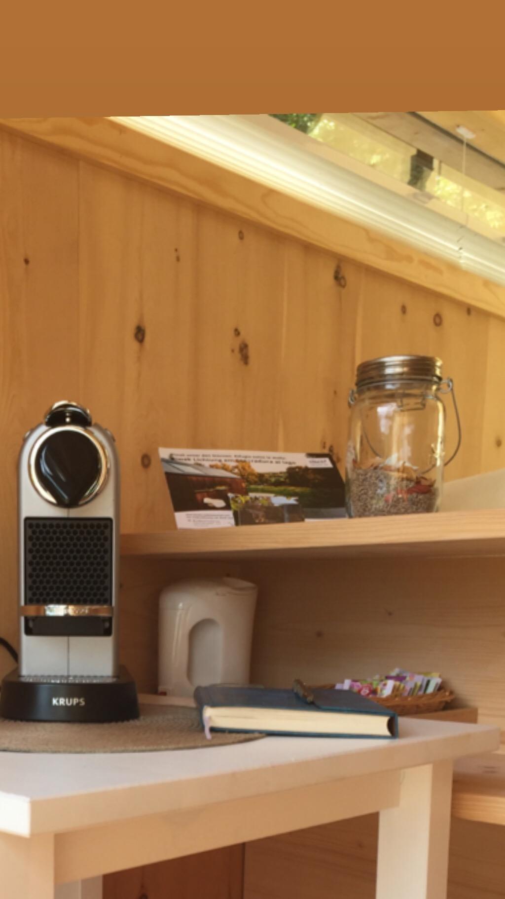Kleines Badezimmer mit Warmwasser und WC, Kingsize-Bett 160x200, Tisch, 2 Sessel, Stauraum unter dem Bett, 2 elektrische Dachflächenfenster, Innenrollo, Infrarotheizung. Terrasse mit Kühlschrank, Tisch mit 2 Sesseln und Sonnenschirm, 2 Liegestühle. Warmwasser-Außendusche. Nespressomaschine mit Kapseln, Wasserkocher mit Teesortiment und Zucker. Picknickkorb mit Tellern, Gläsern, Tassen, Besteck, Salz, Pfeffer, Flaschenöffner, Sektverschluss.