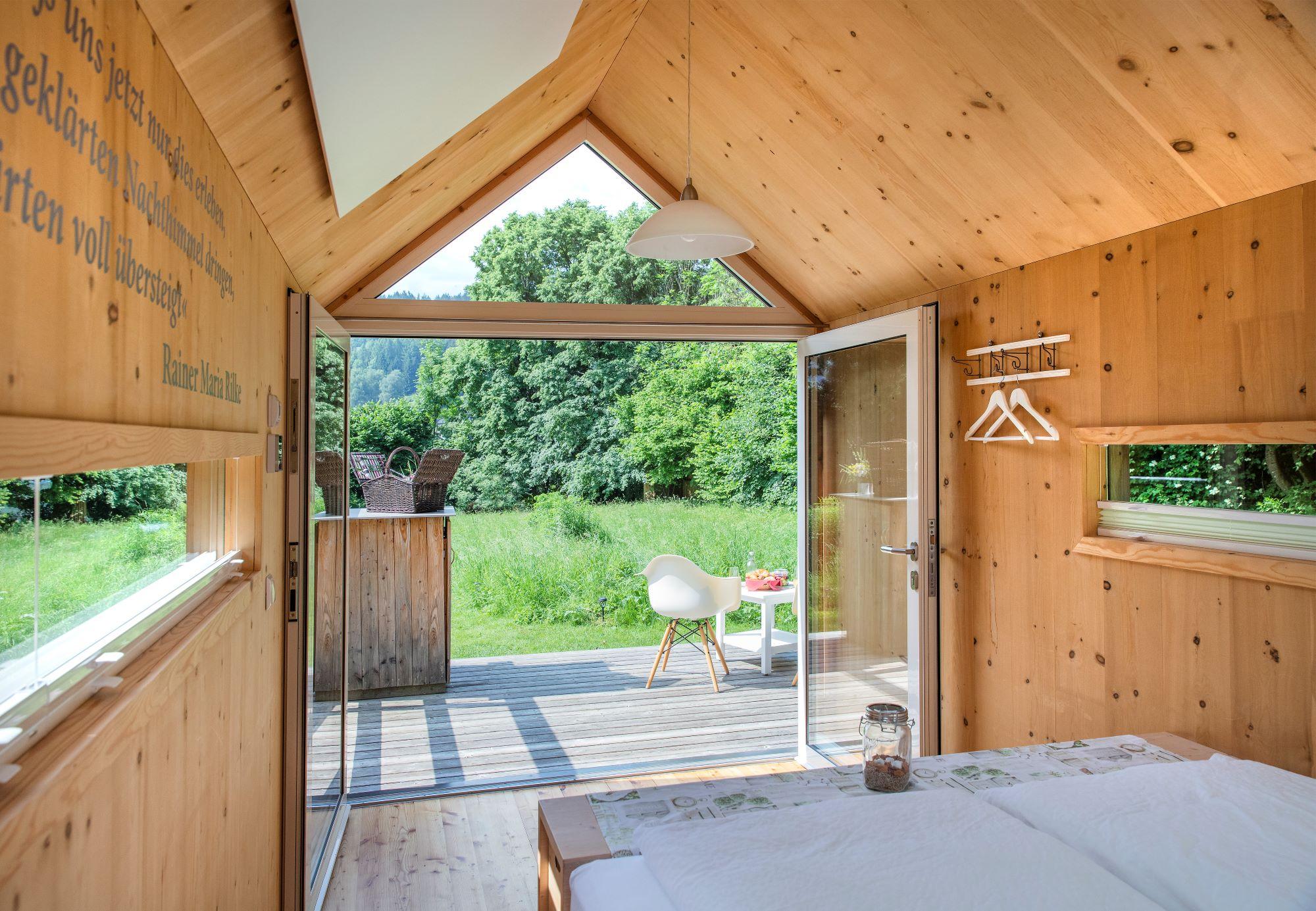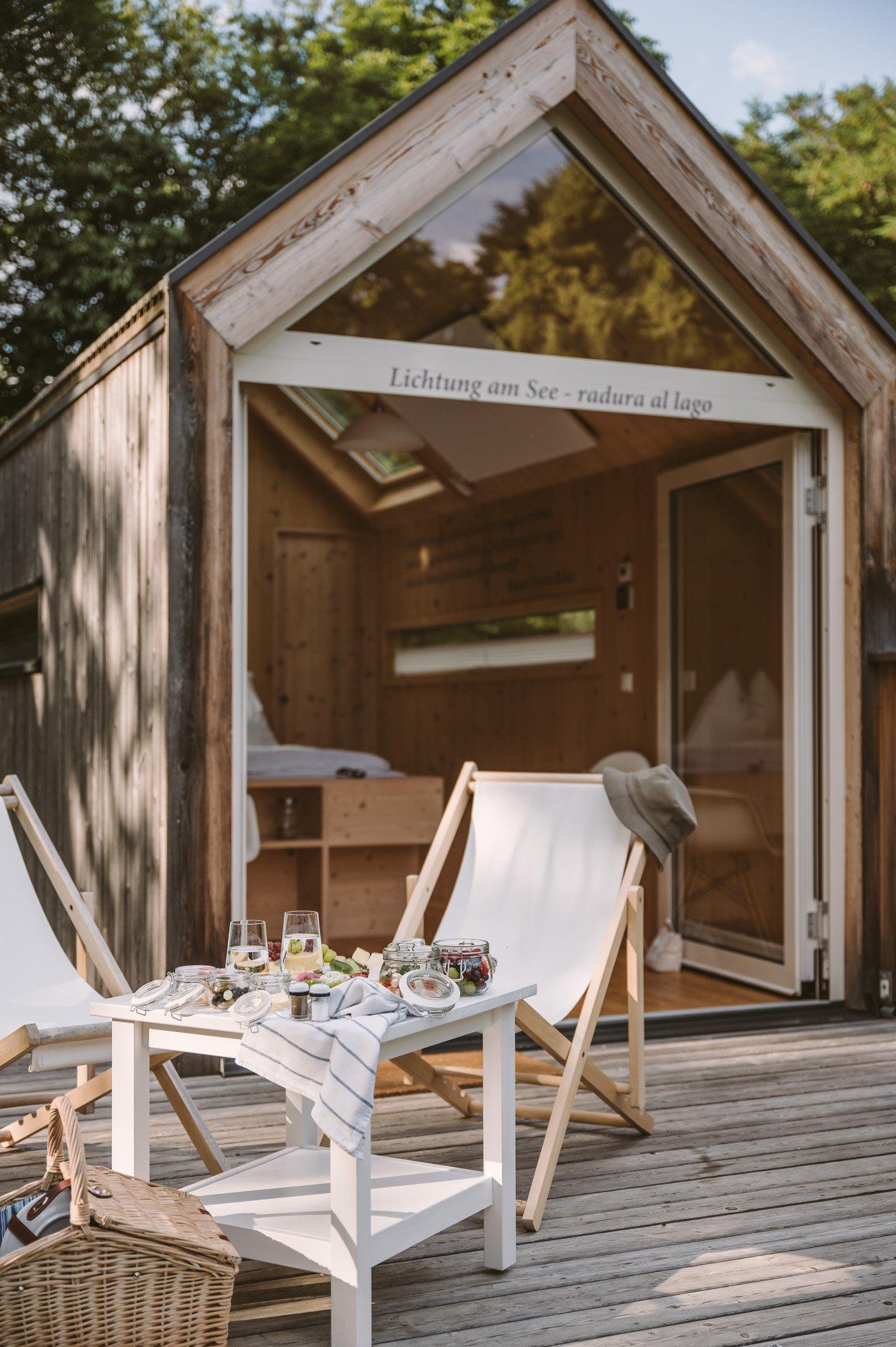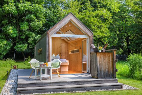 Das refugium am see ist der ultimative Rückzugsort für zwei Personen. Es liegt direkt am See, inmitten einer naturbelassenen Wiese. Obwohl so minimalistisch muss man auf den Komfort nicht verzichten. Im refugium gibt es Warmwasser und eine Warmwasser-Außendusche sowie einen Kühlschrank auf der Terrasse. Nespressomaschine und Wasserkocher gehören auch zur Ausstattung. Sonnenschirm und Liegen befinden sich ebenso beim refugium.