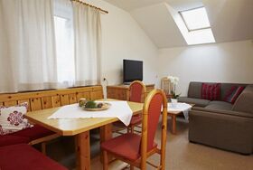 NEUE Zirben-Appartements (für max. 2 Erw. & 2 Ki. - bei App. 2 ev. Platz für 3 Ki.) mit je 2 getrennten Schlafzimmern (1x Doppelbett + 1x 2 Kinderbetten), gemütlichem Wohn-Esszimmer, Küche (inkl. Geschirrspüler & Mikrowelle), Bad mit Dusche/WC, Kabel-TV, W-LAN,