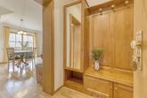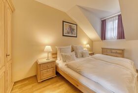 Im separaten Schlafzimmer befinden sich ein Doppelbett und eine freundliche und moderne Holzeinrichtung. Hier ist Platz für 1 Kinderbett.