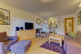 Diese Wohnung hat ein sehr großes und modernes Badezimmer mit zwei Waschbecken, Badewanne mit Dusche und WC. Die Essecke ist für 4 Personen ausgelegt. Das Schlafzimmer hat ein ergonomisches Doppelbett und viel Stauraum für Ihre Garderobe. Ihre Küche bietet Ihnen einen Einbauherd und -ofen, Abzugshaube, Kühlschrank, Spülbecken und Geschirrspüler, Kaffeemaschine, Toaster und alles andere um gutes Essen zuzubereiten. Ein sehr schöner Ausblick vom Südbalkon und der Küche machen diese Wohnung perfekt zu jeder Jahreszeit. Das Besondere hier ist das wirklich große und schöne Tageslichtbad mit zwei Waschbecken, Badewanne mit Dusche und WC.