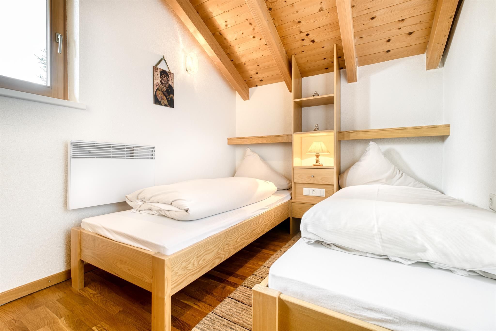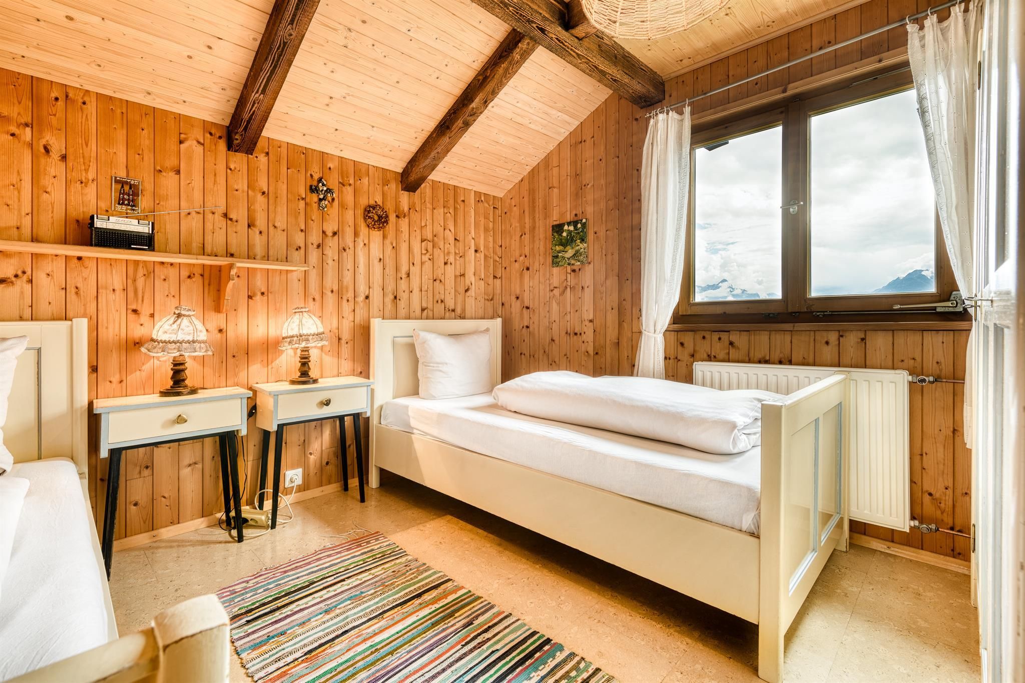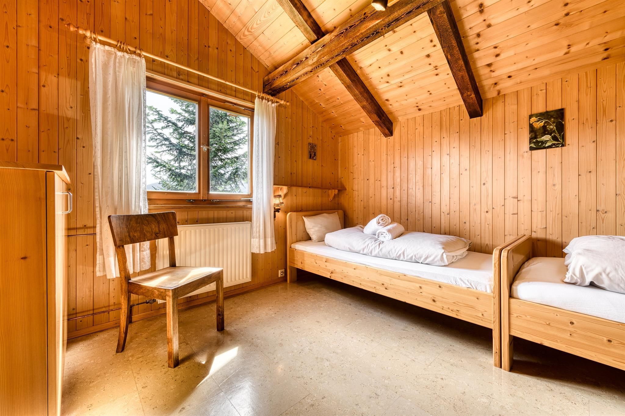 Es zeichnet sich durch eine einmalige, ruhige und sonnige Lage aus und bietet eine wunderbare Aussicht auf die Bergwelt. Die Hütte verfügt über 75m2 auf 2 Stockwerken verteilt und bietet Platz für maximal 10 Personen, aufgeteilt auf 5 Schlafzimmer mit Einzelbetten und ein Stockbett befindet sich in einem der Wohnzimmer, welches als Durchgangszimmer dient.