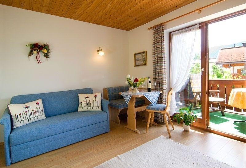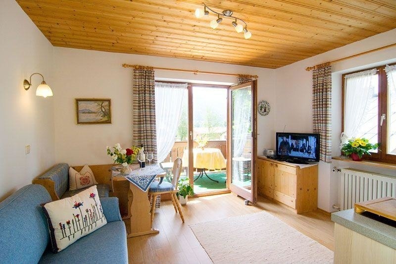Wir bieten Ihnen eine gemütliche Zweiraum-Wohnung mit Südbalkon in zentraler Lage am Südhang von Reit im Winkl.