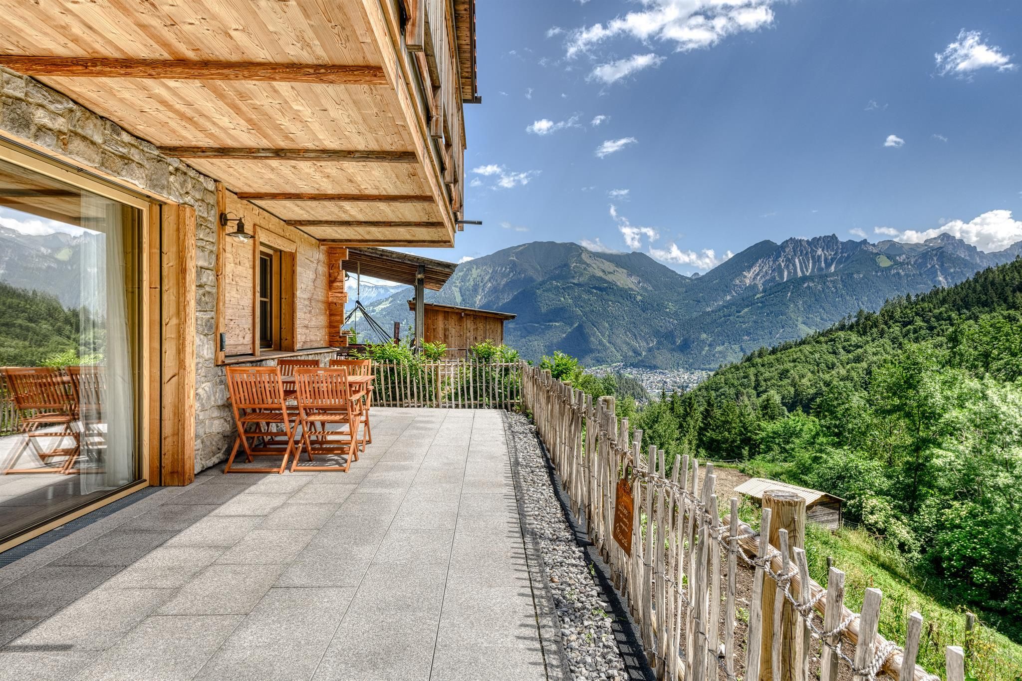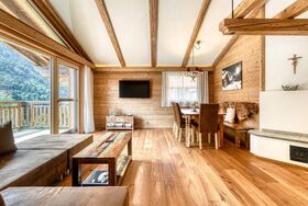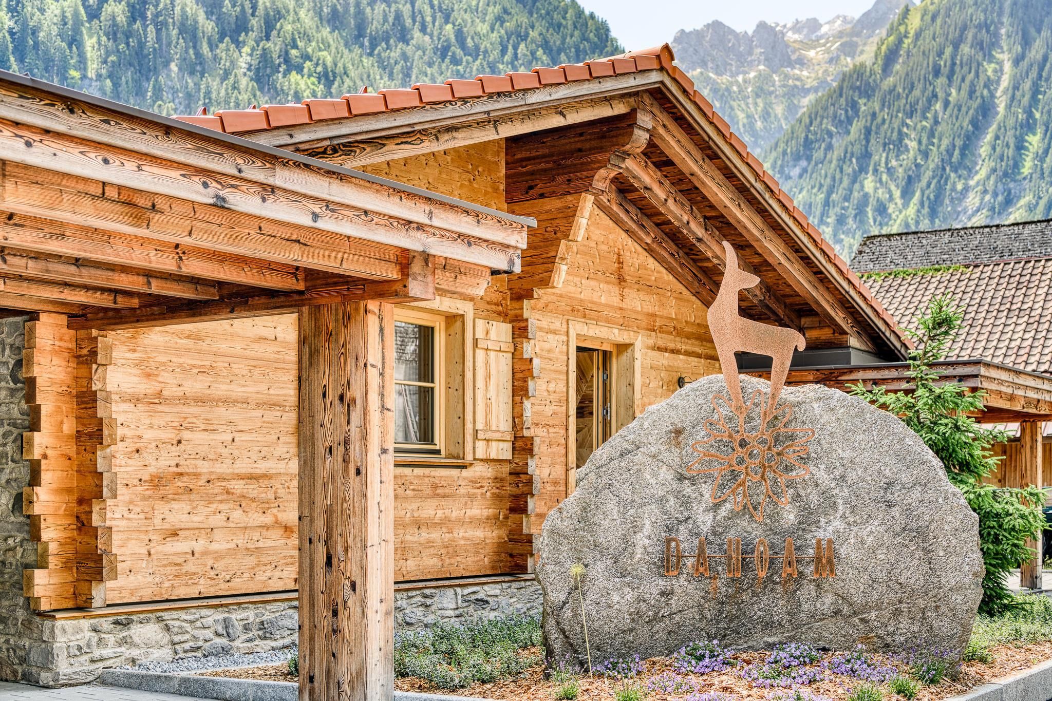 Die besondere Lage macht das urig-edle Ferienwohnhaus zu einem Blickfang und ist gleichzeitig für seine Gäste der ideale Ausgangspunkt für erholsame Urlaubstage. Klein aber fein! Die nur 4 Appartements, aufgeteilt auf 2 Baukörper liegen auf einem Plateau mit Blick auf die umliegende Bergwelt. Die Apartments im Obergeschoss verfügen über einen Balkone. Die Wohnungen im Erdgeschoss besitzen eine überdachte Terrasse mit Garten. Alle Wohnungen verfügen über einen Carport. Altholz, die rustikale Bauweise und Steinwandverkleidungen lassen den ganz besonderen Charakter der Dahoam-Apartmens zur Geltung kommen. Durch das perfekt abgestimmte Zusammenspiel von handwerklicher Qualität, architektonischer Kreativität und technischer Exzellenz wurde eine Vision wahr, die auch aus ökonomischer und ökologischer Sicht überzeugt.