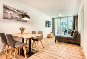 Unsere modern und funktional eingerichteten Ferienwohnungen im Alpenstil bieten Platz für bis 8 Personen. Jedes Schlafzimmer mit Doppelbett hat dabei sein eigenes Bad, die Küche ist voll ausgestattet und bietet je nach Größe genügend Platz, um am gemütlichen Esstisch den Tag ausklingen zu lassen. Der Balkon bietet einen wunderschönen, unverbauten Blick auf das Bergpanorama. In der gemütlichen Sitzecke können Sie bei einem spannenden Buch die Füße hochlegen.
