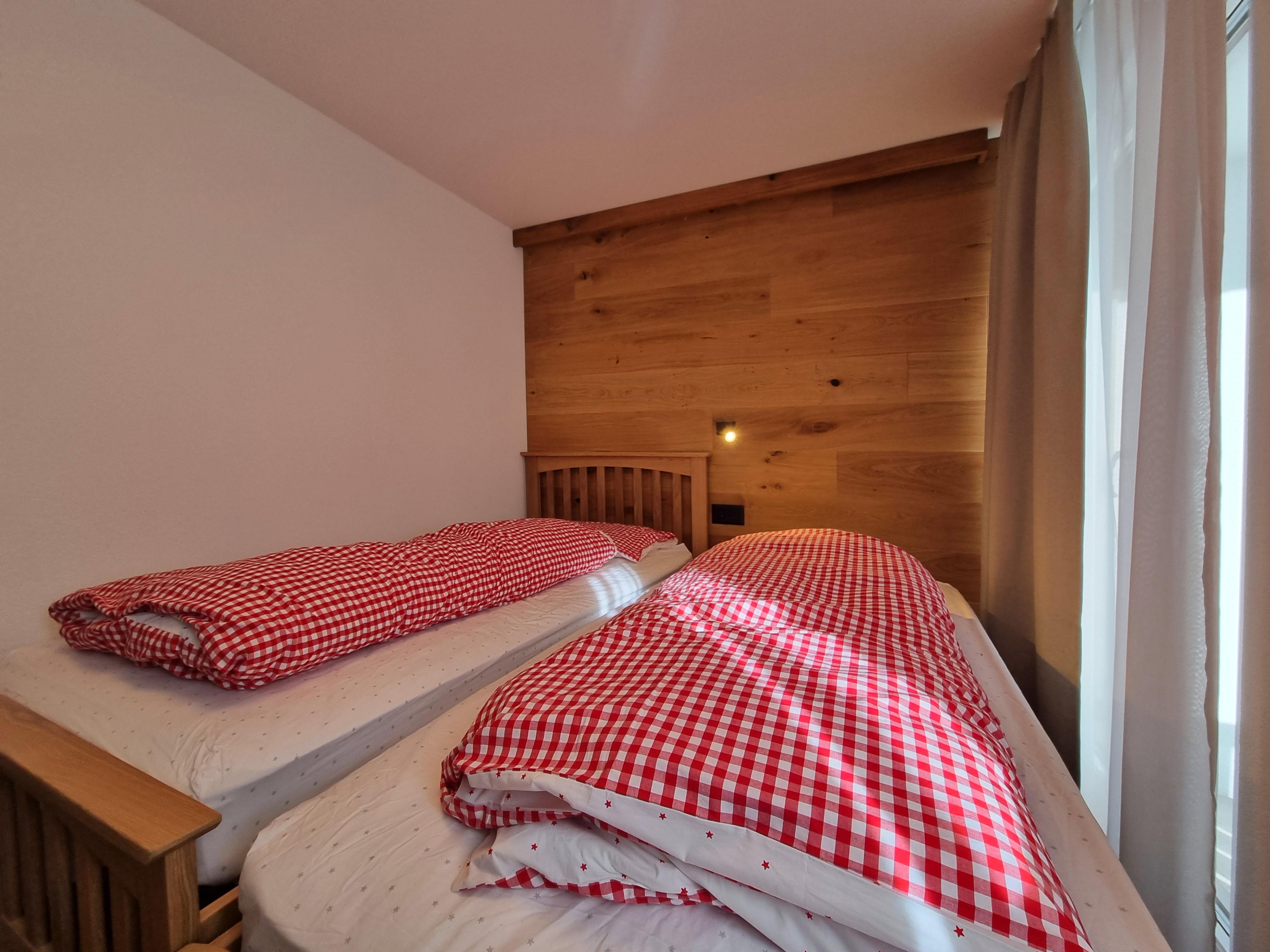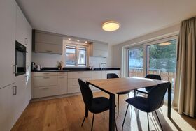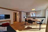 Die Wohnung befindet sich im 1.OG und wurde kürzlich komplett renoviert. Die Wohnung hat 2 Schlafzimmer und 2 Badezimmer. Ein Schlafzimmer ist ausgestattet mit einem Doppelbett, das zweite Schlafzimmer hat 2 Einzelbetten. Ein Badezimmer ist en-suite mit Dusche, Toilette & Waschbecken, das zweite Badezimmer verfügt über eine Badewanne, Toilette & Waschbecken. Das Wohnzimmer hat ein gemütliches Sofa und die Essecke vor der offenen und modernen Küche. Vom Wohnzimmer findet man auch den Ausgang zum südlich ausgerichteten Balkon mit blick auf das Skigebiet.