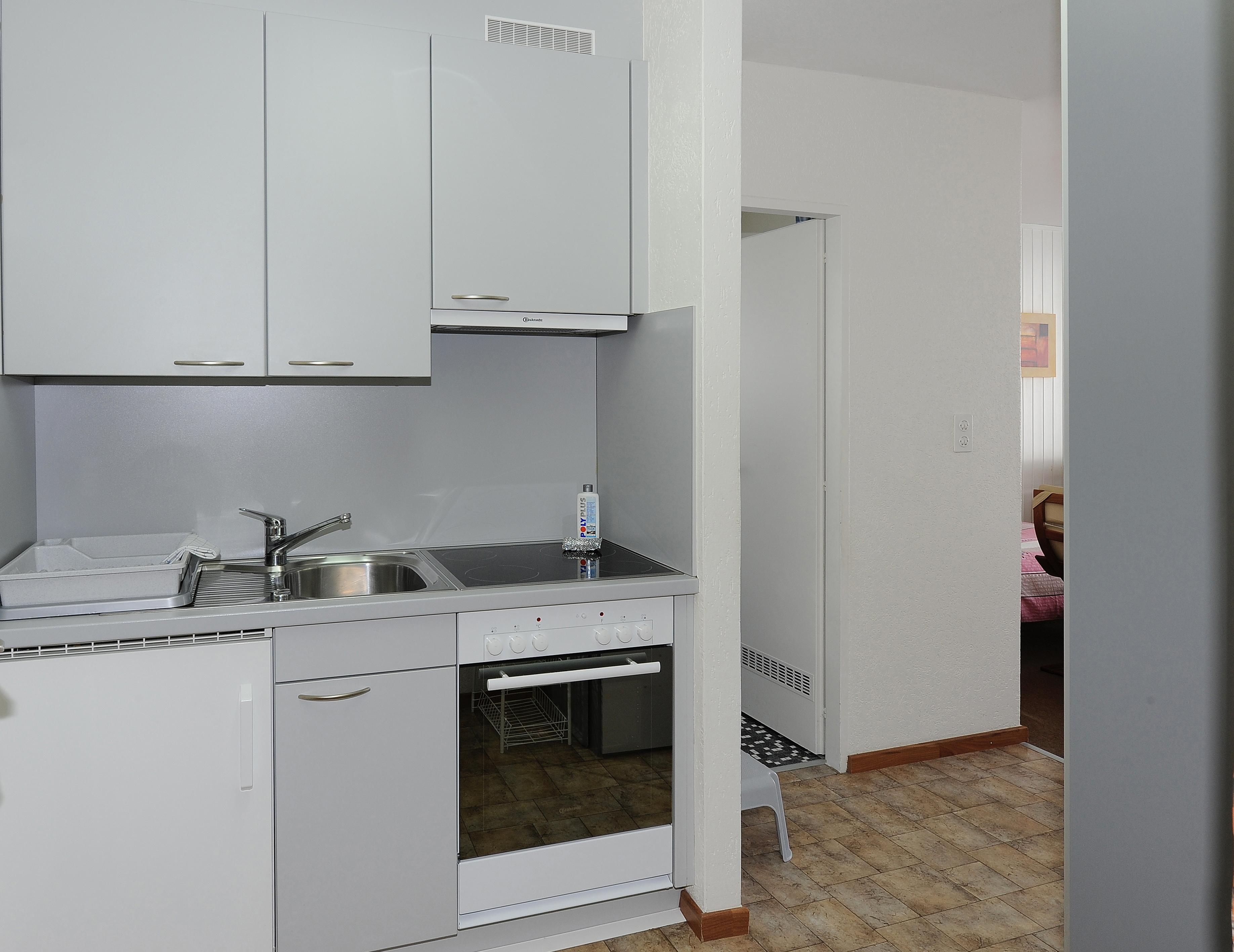 1-Zimmerwohnung: Wohn-/Ess-/Schlafzimmer mit 2 Einzelbetten, Kochnische, Bad/WC, Südbalkon, Grosse Dachterasse, TV, Radio, gratis WiFi, Lift.