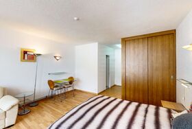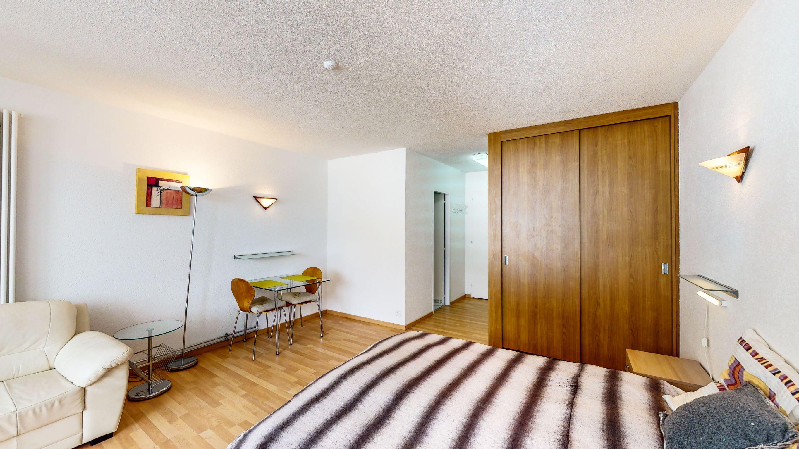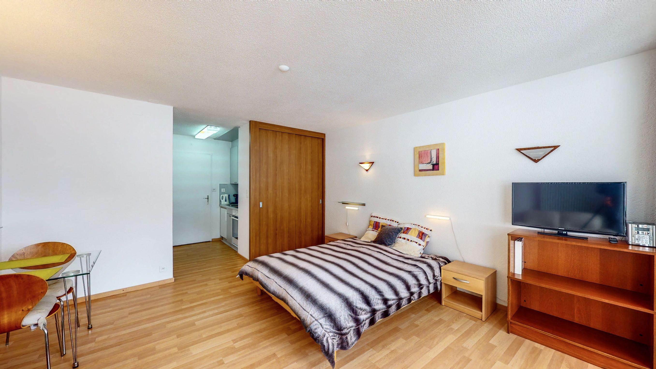 1-Zimmerwohnung: Wohn-/Ess-/Schlafzimmer mit 1 Doppelbett, Kochnische, Bad/WC, Südbalkon, Grosse Dachterasse, TV, Radio, gratis WiFi, Lift.