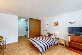 1-Zimmerwohnung: Wohn-/Ess-/Schlafzimmer mit 1 Doppelbett, Kochnische, Bad/WC, Südbalkon, Grosse Dachterasse, TV, Radio, gratis WiFi, Lift.