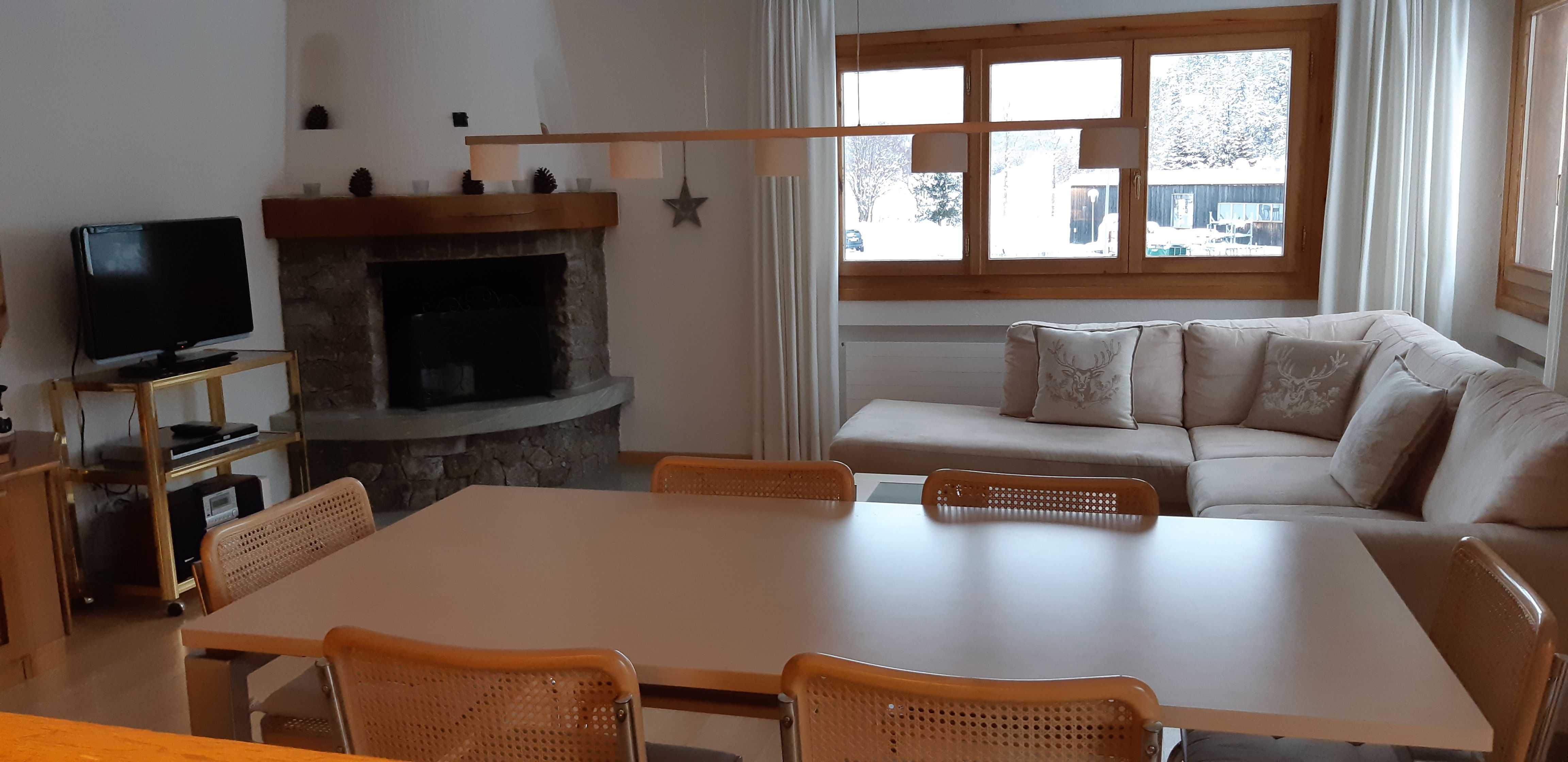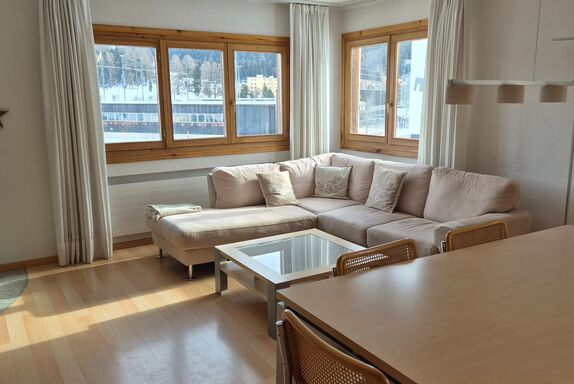 Wohn-/Esszimmer: grosszügiges Wohn-Esszimmer mit hellem Sofa, TV, Radio und gratis WLAN. Esstisch für 6 Personen, Aussicht auf den St. Moritzersee und das Bergpanorama