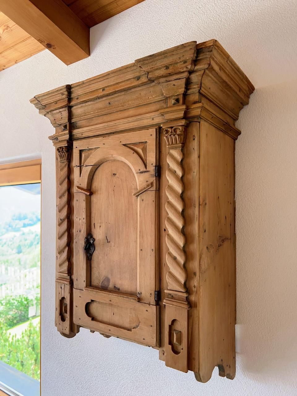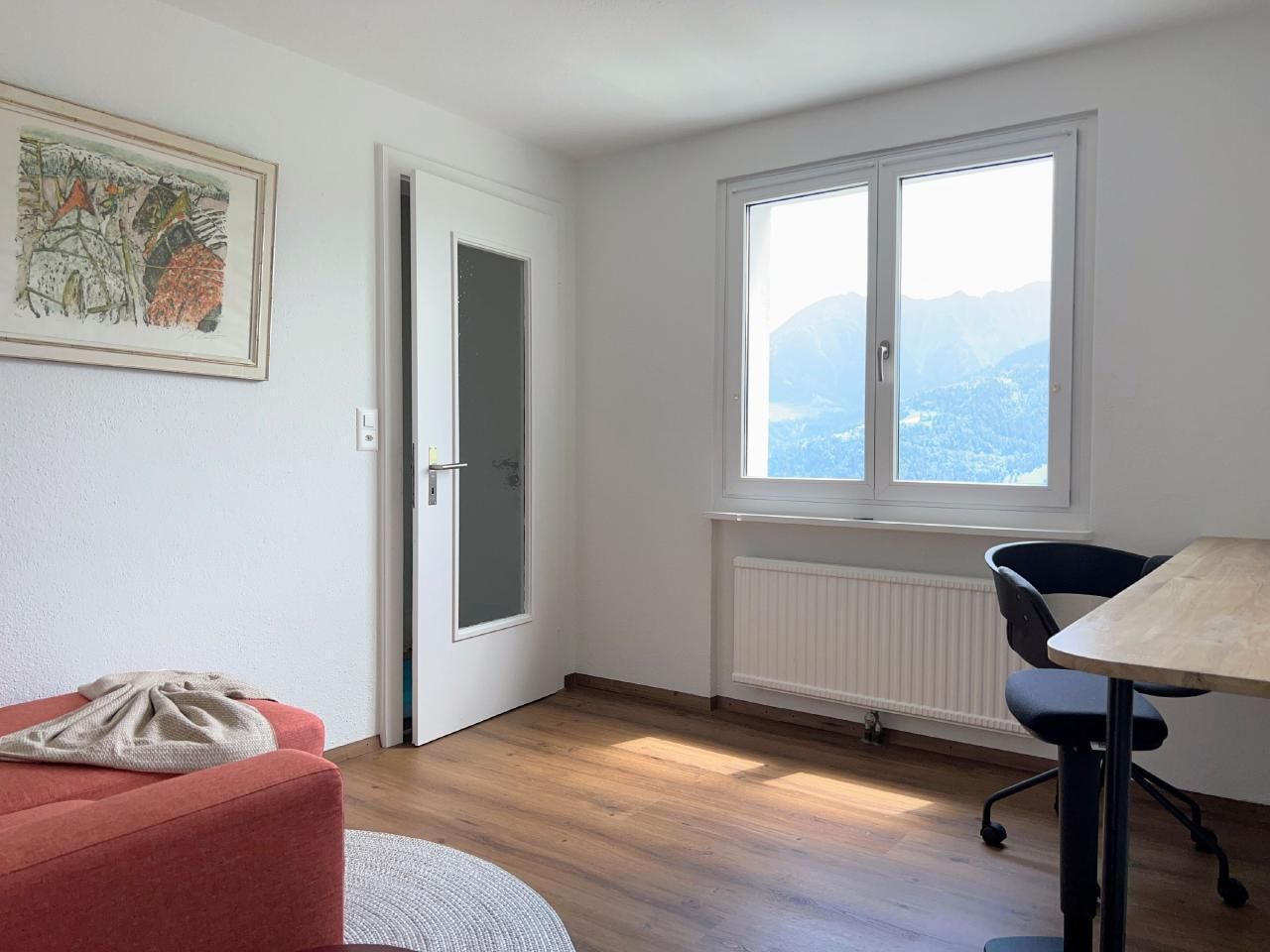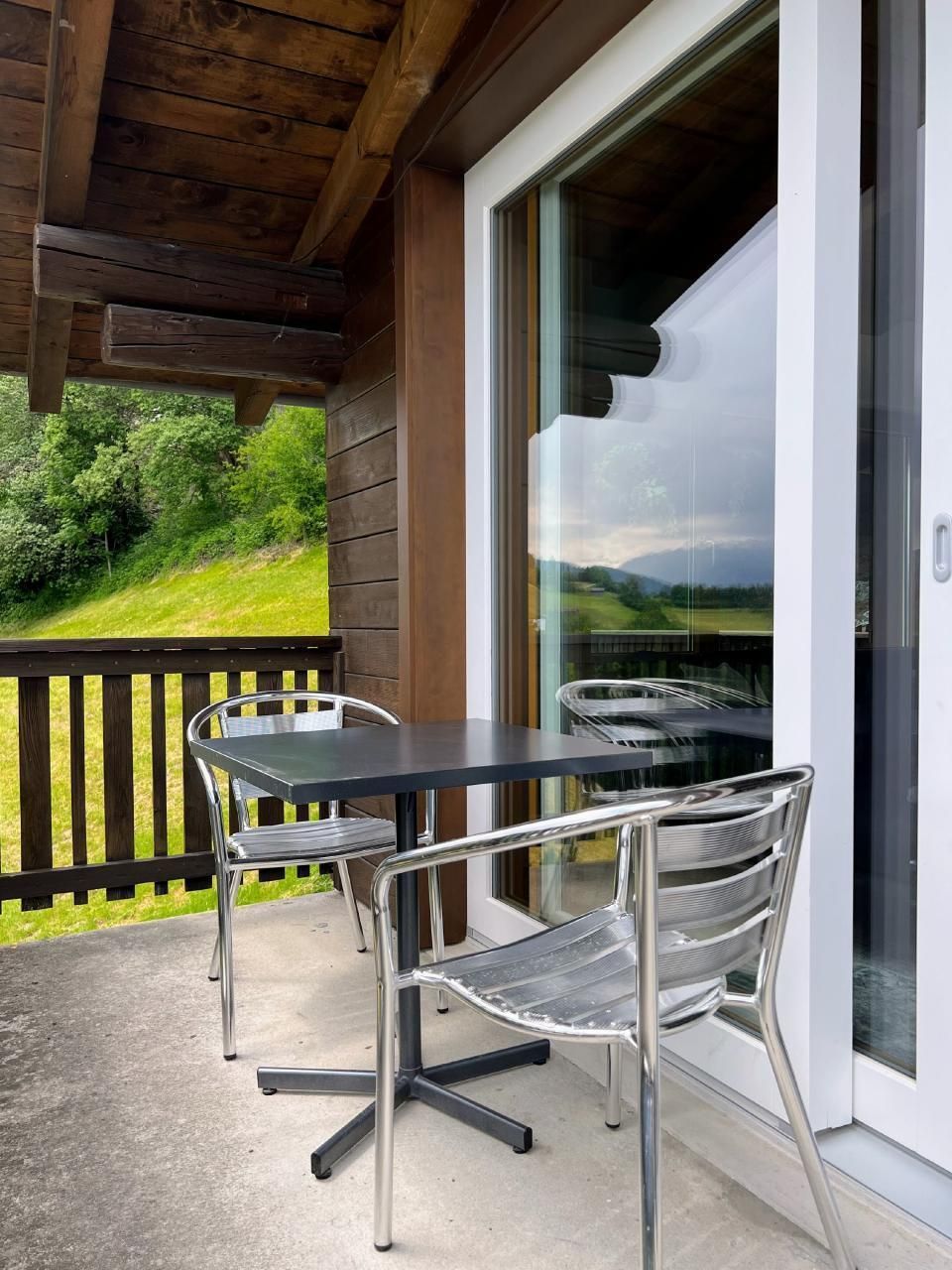 Im Obergeschoss befinden sich der Haupteingang, 3 Schlafzimmer, 2 Bäder und der kürzlich kombinierte Küchen-/Wohnbereich mit übergroßen Fenstern, die einen spektakulären Blick auf die umliegenden Berge bieten. Ein 200 Jahre alter Massivholztisch bietet Platz für 10 Personen und ein 65-Zoll-4K-Fernseher sorgt für gute Unterhaltung. Von diesem Raum aus gelangt man auch auf den Balkon und die Terrasse, die beide absolute Privatsphäre (keine Nachbarn im Westen...) und einen atemberaubenden Blick auf die Berge und das darunter liegende Tal bieten.
