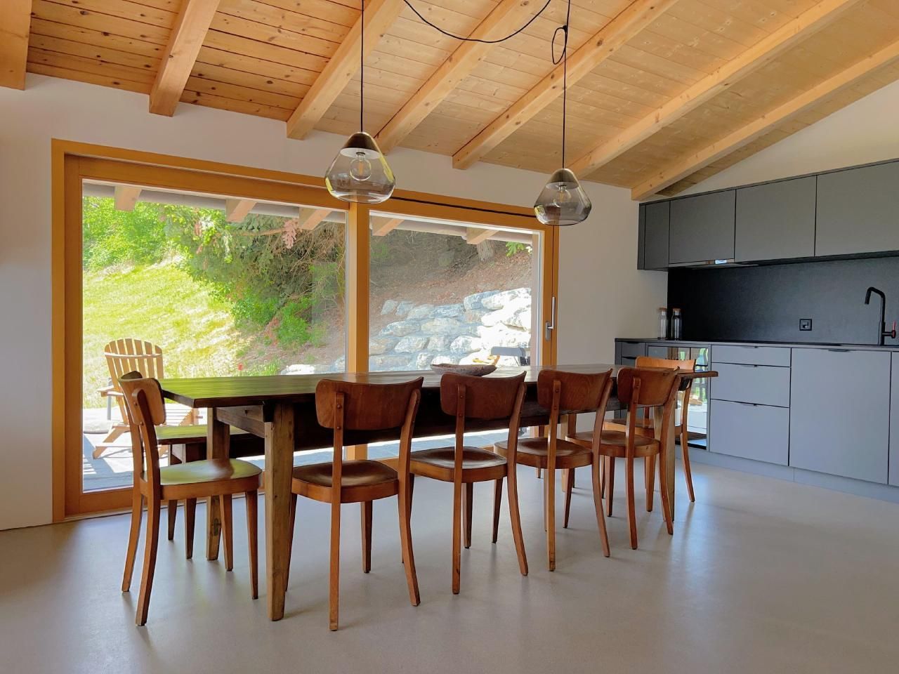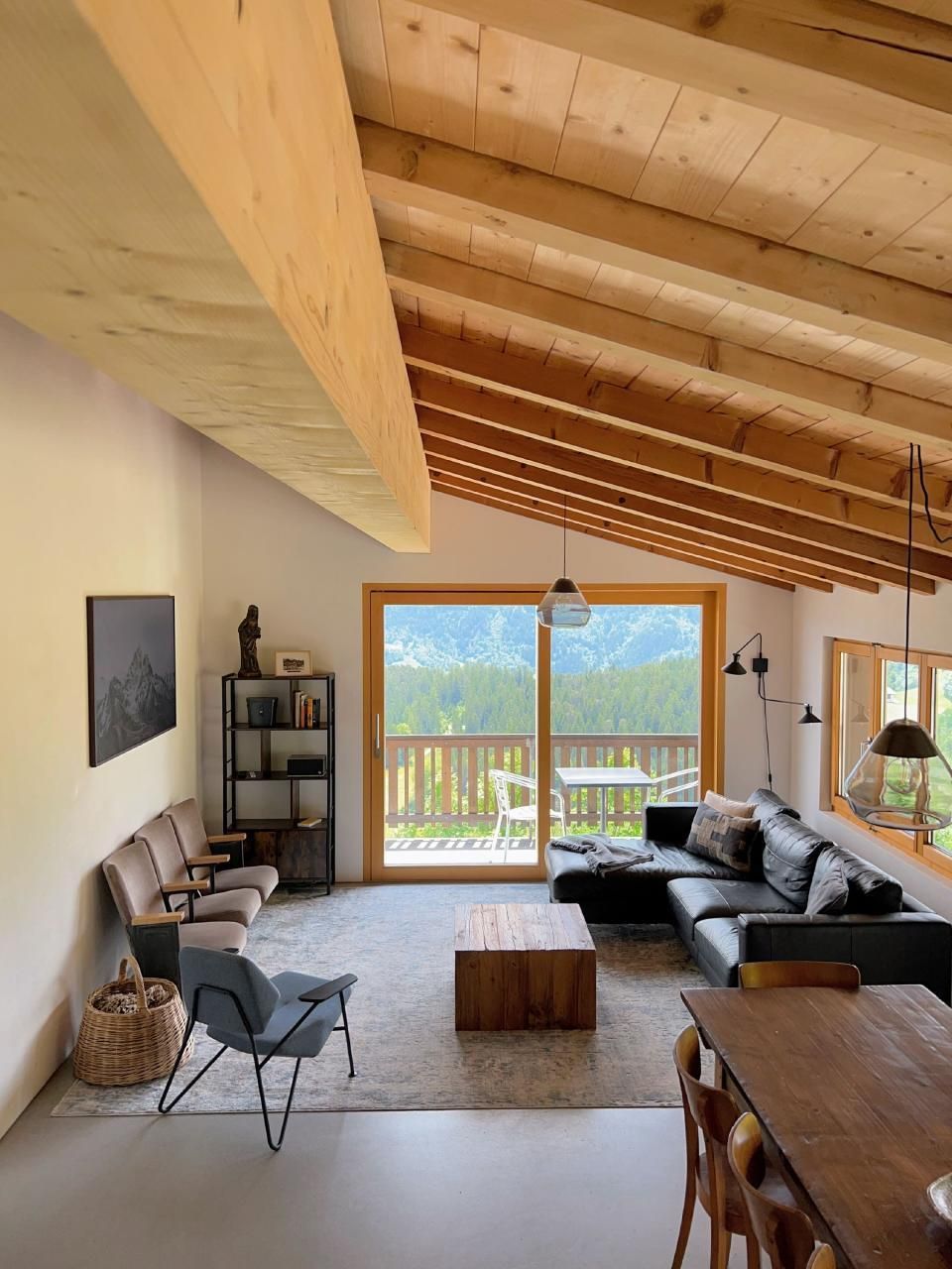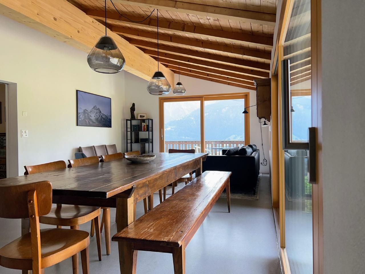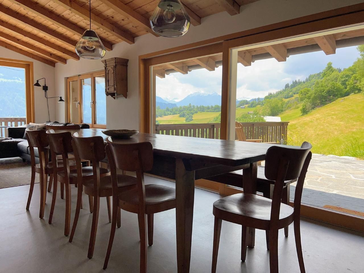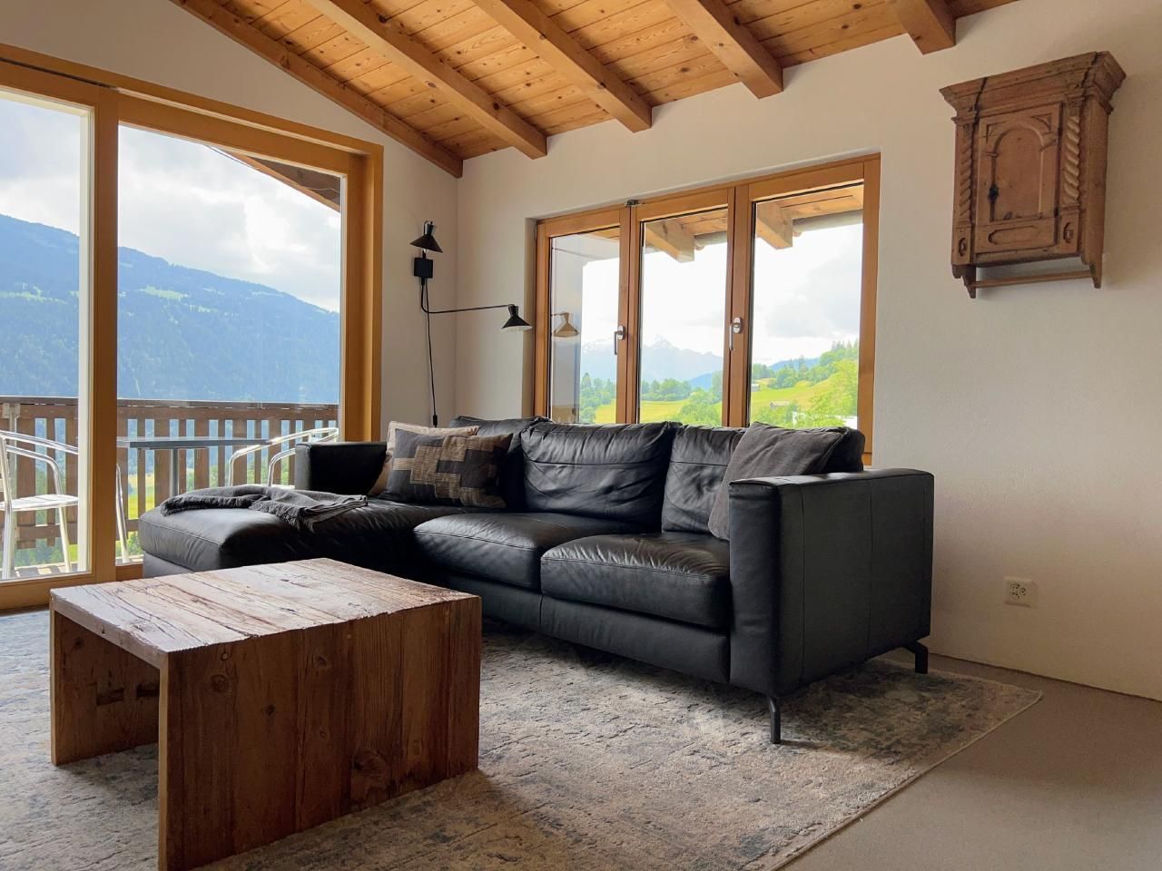 4 der 5 Schlafzimmer haben Bergblick - und das einzige Geräusch, das Sie nachts hören werden, sind vielleicht Kuhglocken. Der große, offene Ess-/Sitzbereich lädt zum gemütlichen Beisammensein mit bis zu 10 Personen an einem Tisch ein - oder verteilt auf den Raum und den Balkon/Terrasse.