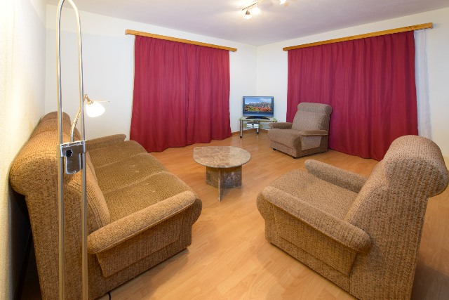 Die 3-Zimmerwohnung liegt im Erdgeschoss und verfügt über 2 Schlafzimmer (je 2 Betten), separates Wohnzimmer mit TV, Radio, Internet. Abgeschlossene Küche mit Esstisch, Geschirrspüler. Bad/WC/Dusche. Südbalkon (11m2). Die Wohnung wurde 2007 neu renoviert.