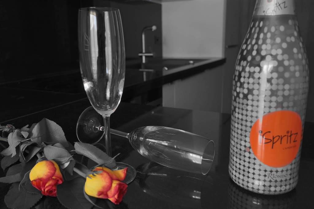 Neue, moderne, gut ausgestattete Küche in Marmor: Spülbecken, Kühlschrank, Induktionsherd, Backofen mit integrierter Mikrowelle und einer Geschirrspülmaschine. Das Wohnzimmer ist mit einem Sofa, Flachbildschirm (Satelliten TV), Radio (DAB+, CD, Bluetooth, NFC), Telefon und einem Esstisch ausgestattet.