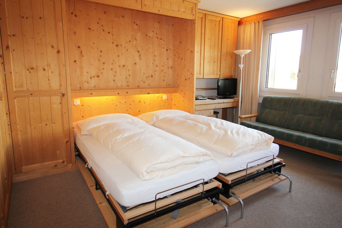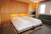 Gemütliche 1-Zimmer Wohnung im Hochparterre gelegen, mit einem Wohn-Schlaf-Esszimmer mit zwei elektrischen Schrankbetten, einem Sofa, einem Esstisch, einer separaten Küche, Bad/WC mit Fenster und einem verglasten Balkon Richtung Osten. Radio und CD Player, Fernseher und Telefon, kostenloses W-LAN sind ebenfalls in der Wohnung enthalten.