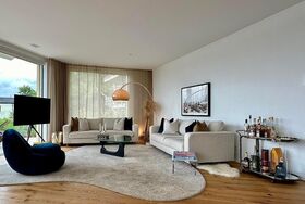 Sonstige Wohnzimmerausstattung (Wohnzimmer1): zwei grosse Couches, Sessel, Fernseher mit NETFLIX/Disney+ etc., elektrische Rollladen, Bang&Olufsen Stereoanlage, dimmbares Licht
