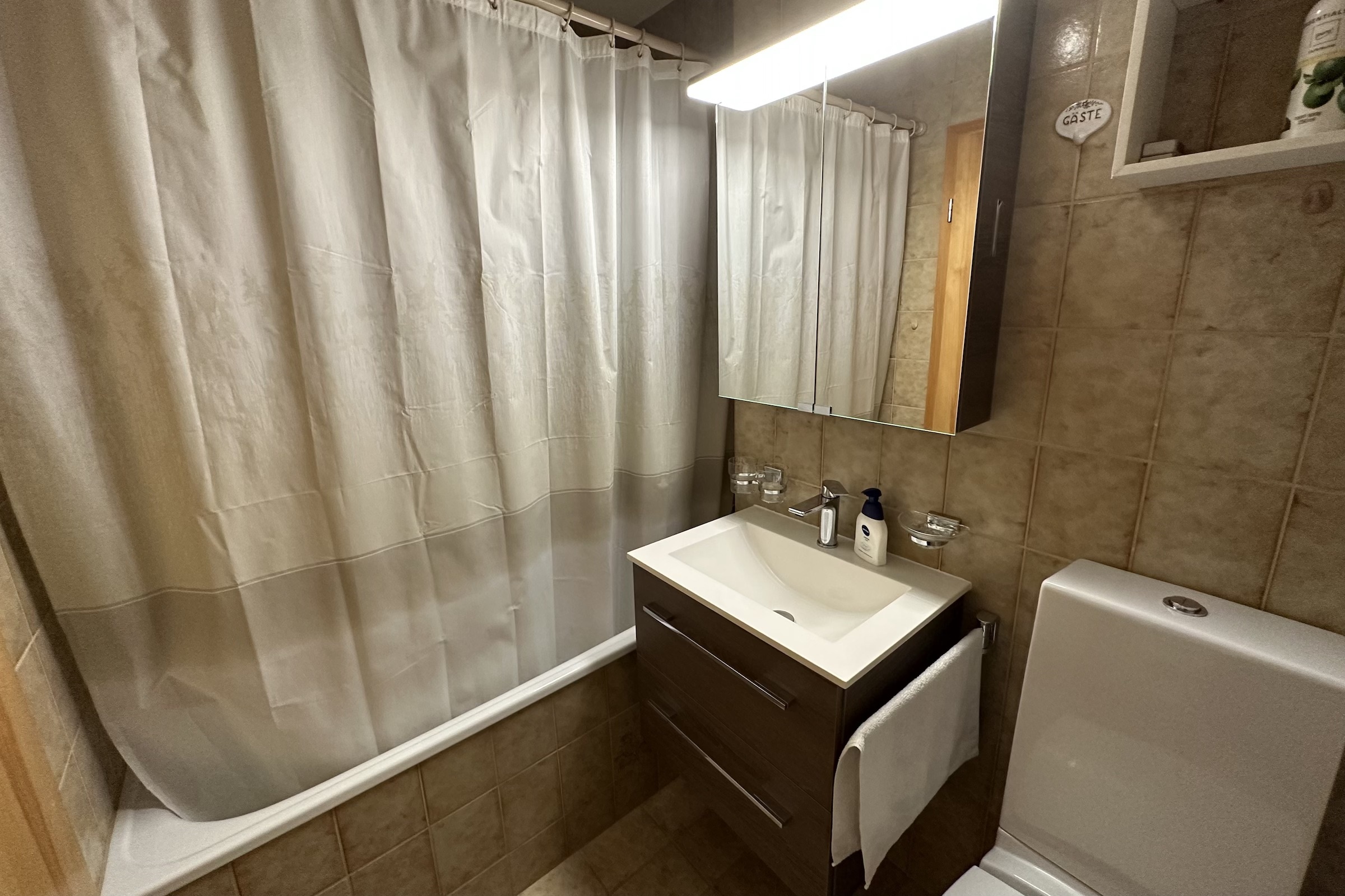 Ein Badezimmer mit Badewanne, WC und Lavabo. Haartrockner ist vorhanden.Wohnzimmer