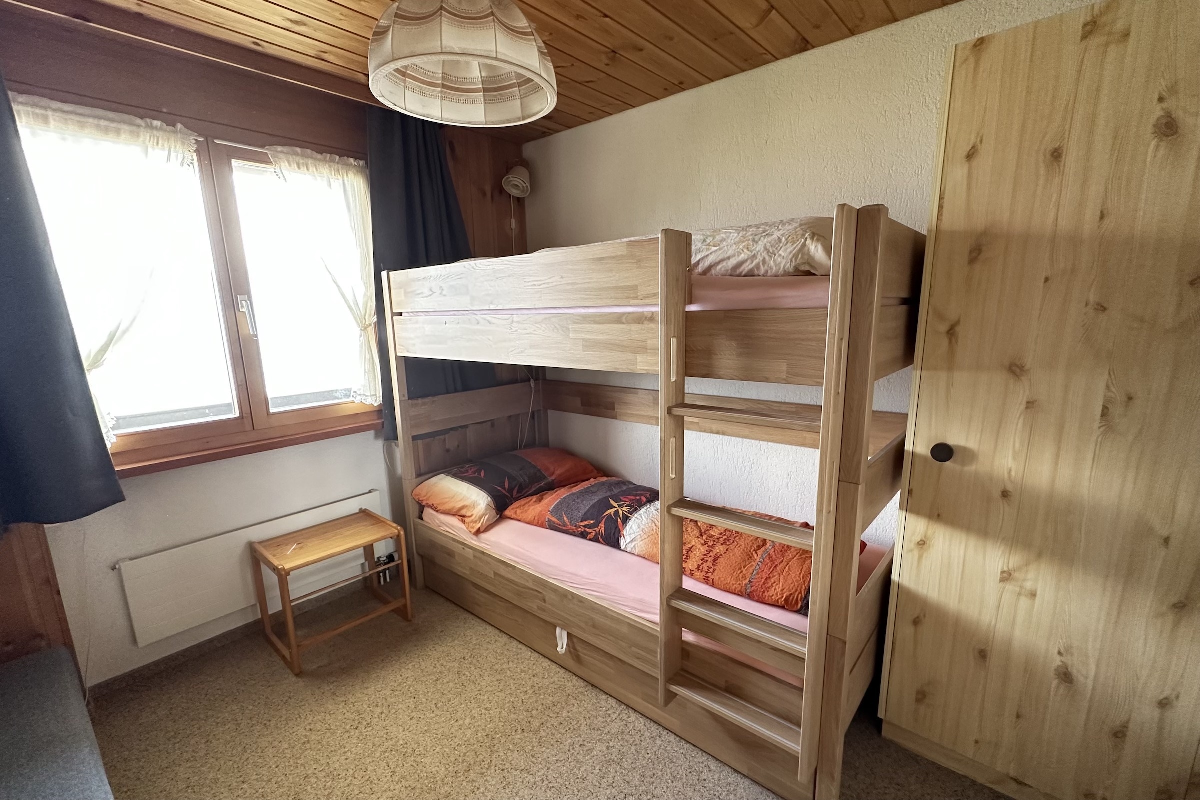 Zwei Schlafzimmer; ein Zimmer mit grossem Doppelbett und ein Zimmer mit einem Stockbett und einem integrierten Ausziehbett.Badezimmer