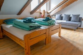 Gemütliche Zimmer mit 2 Einzelbetten und zusätzlichem 2er-Bettsofa, Dusche/WC/ttwäsche, Handtücher, Haartrockner vorhanden. Kostenloses WLAN. Hunde erlaubt.