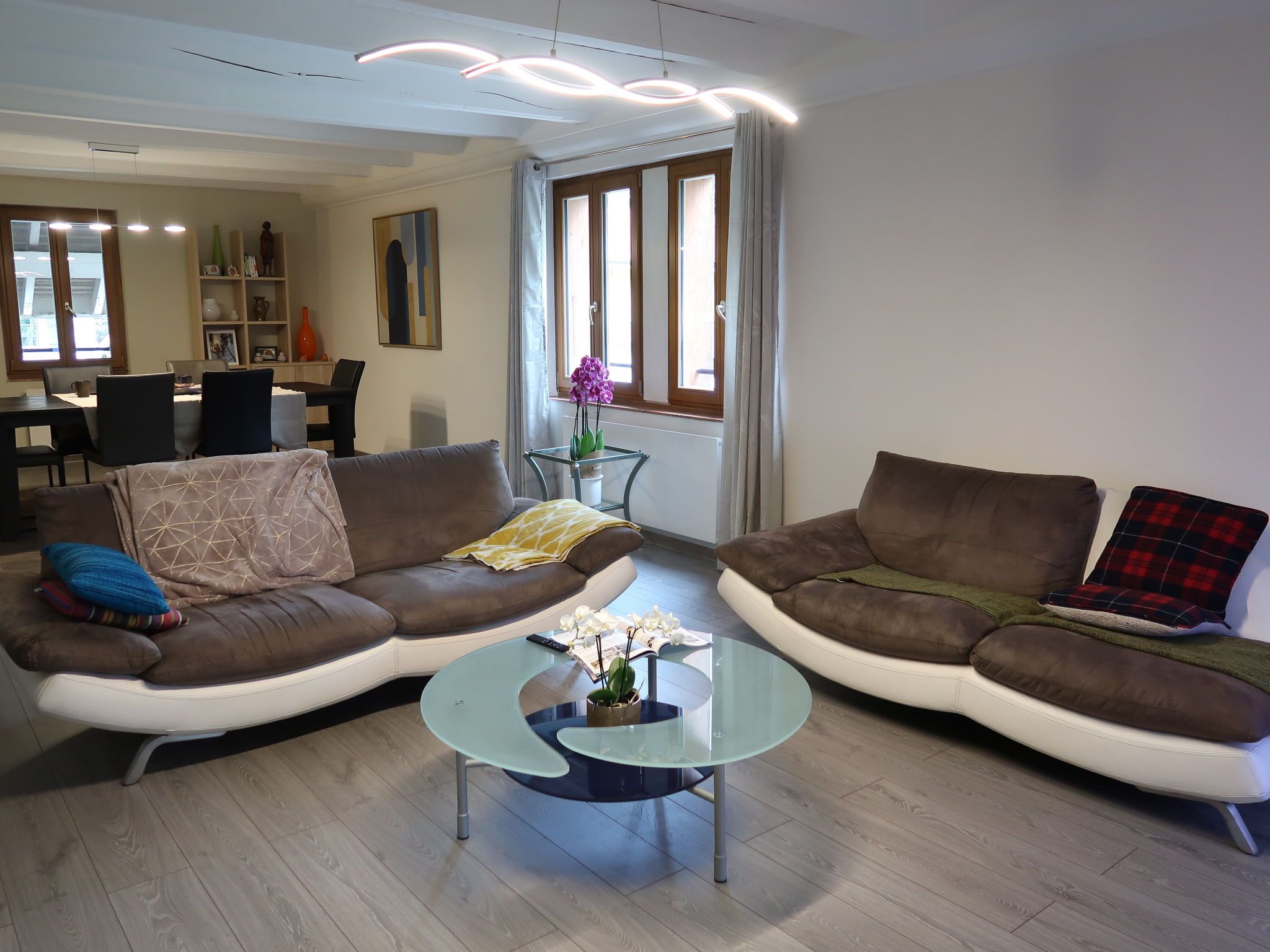 L'Avenir, 4-Zimmer-Wohnung auf 2 Stockwerken. Objekt geeignet für 3 Erwachsene + 2 Kinder. Schön und geschmackvoll eingerichtet: Wohn-/Esszimmer mit TV. Offene Küche (Backofen, Geschirrspüler, 4 Glaskeramikplatten, Toaster, Wasserkocher, Tiefkühler, elektrische Kaffeemaschine, Kapseln für die Kaffeemaschine (Nespresso)). Sep. WC. Obergeschoss: 1 Zimmer mit 1 Doppelbett (160 cm, Länge 200 cm). 1 Kinderzimmer mit 1 x 2 Etagenbetten (90 cm, Länge 200 cm). 1 Zimmer mit 1 Bett (90 cm, Länge 200 cm). Dusche/WC. Ölheizung. Grosser Gartensitzplatz. Keine Sicht. Zur Verfügung: Internet (Wireless LAN). Parkplatz (2 Autos). Bitte beachten: Nichtraucher-Unterkunft.