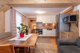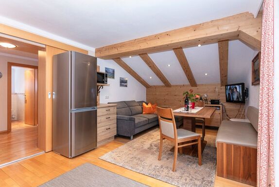 Modern, rustikal, ausgestattete Ferienwohnung mit 2 Schlafzimmer, geräumige Wohnküche mit Ausziehcouch, Spülmaschine, 4 Plattenherd (Ceran)mit Backrohr, Essplatz, sep. Dusche, sep. WC und Balkon -