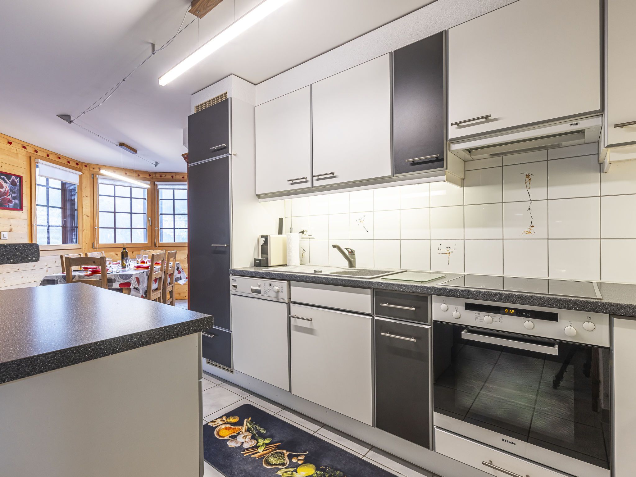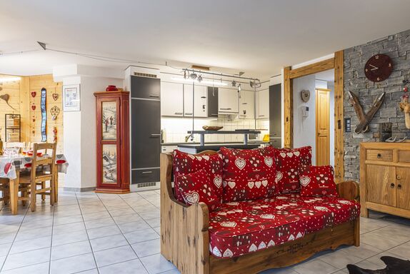 Bouquetins, 3-Zimmer-Wohnung 100 m2 im 1. Stock. Geschmackvoll und gemütlich eingerichtet: offenes grosses Wohn-/Esszimmer mit 1 Doppeldiwanbett, Schwedenofen und TV. Ausgang zum Balkon. 1 Zimmer mit 1 Doppelbett (160 cm, Länge 200 cm), Bad/WC. 1 Zimmer mit 1 x 2 Etagenbetten, 1 Wandschrankbett. Offene Küche (Backofen, Geschirrspüler, 4 Glaskeramikplatten, Toaster, Wasserkocher, Mikrowelle, elektrische Kaffeemaschine, Racletteofen, Fondue Set (Chinoise, Käse)). Dusche/WC. Balkon. Balkonmöbel. Herrliche Sicht auf die Berge und die Ortschaft. Zur Verfügung: Bügeleisen. Internet (Wireless LAN, gratis). Parkplatz, Garage, Höhe 200 cm. Bitte beachten: Nichtraucher-Unterkunft.