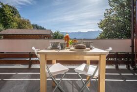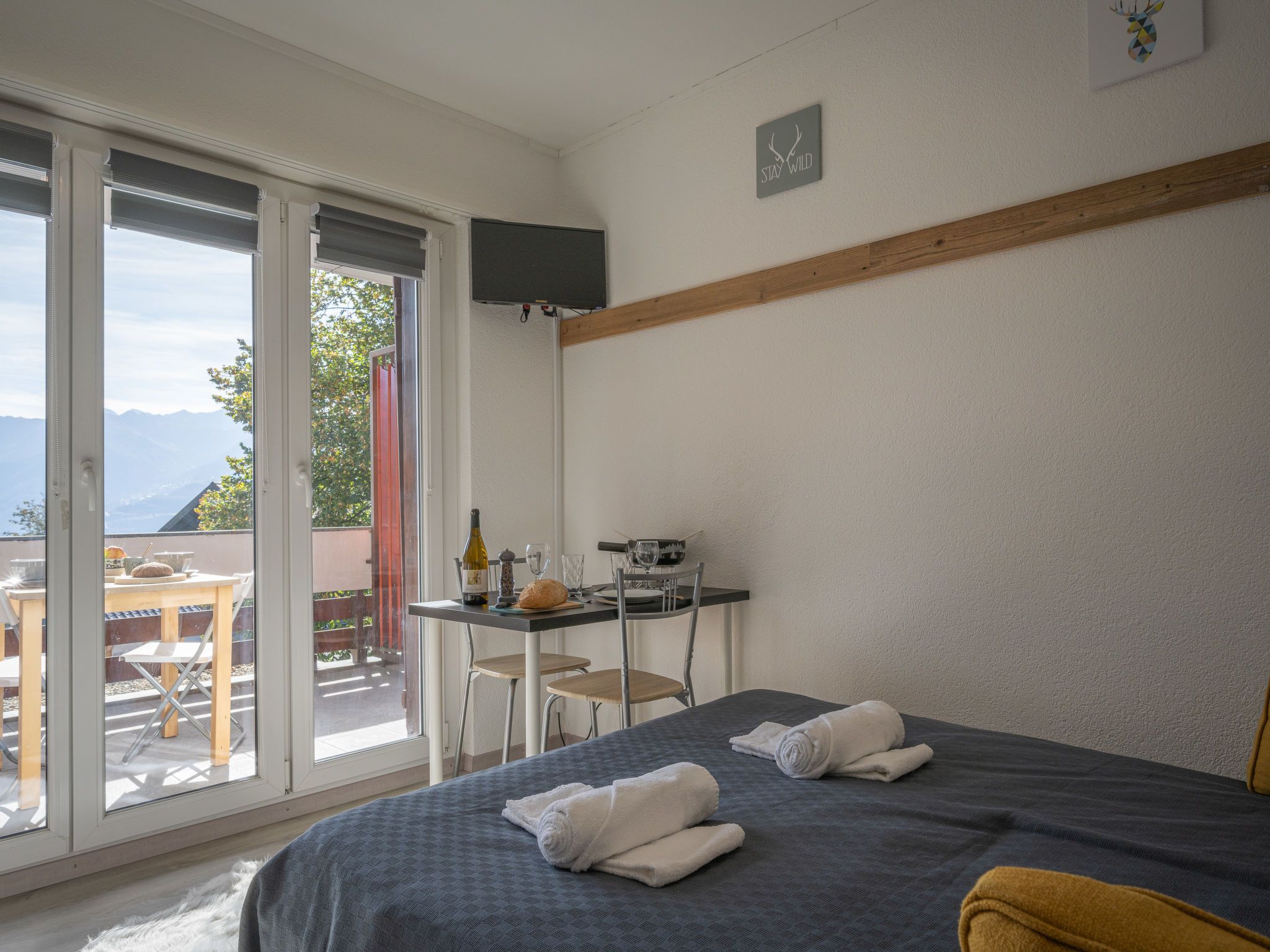 Beau séjour 15, 1-Zimmer-Studio 15 m2 im 1. Stock, Südostlage. Zweckmässig und komfortabel eingerichtet: Wohn-/Schlafzimmer mit 1 Doppeldiwanbett (1 x 140 cm, Länge 190 cm), Essecke und TV. Ausgang zum Balkon, Richtung Südosten. Kleine, offene Küche (Backofen, 4 Glaskeramikplatten, Wasserkocher, elektrische Kaffeemaschine, Kapseln für die Kaffeemaschine (Délizio) extra, Racletteofen, Fondue Set (Käse)) mit Esstisch. Ausgang zum Balkon. Dusche/WC. Balkon 10 m2, Südostlage. Balkonmöbel. Sicht auf die Berge. Zur Verfügung: Internet (Analog/ISDN, gratis). Parkplatz (1 Auto). Bitte beachten: Nichtraucher-Unterkunft.