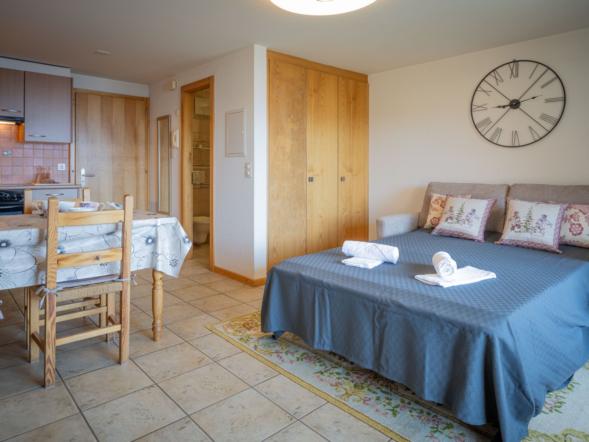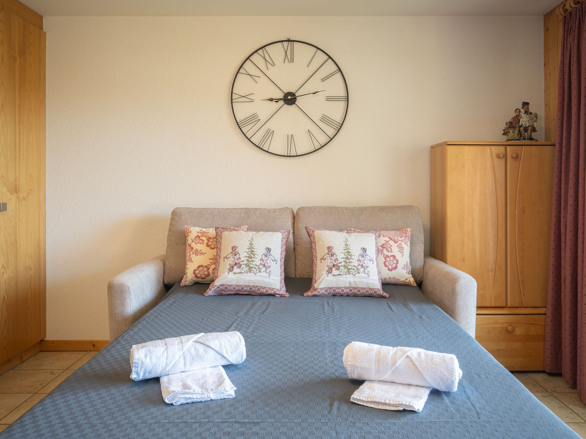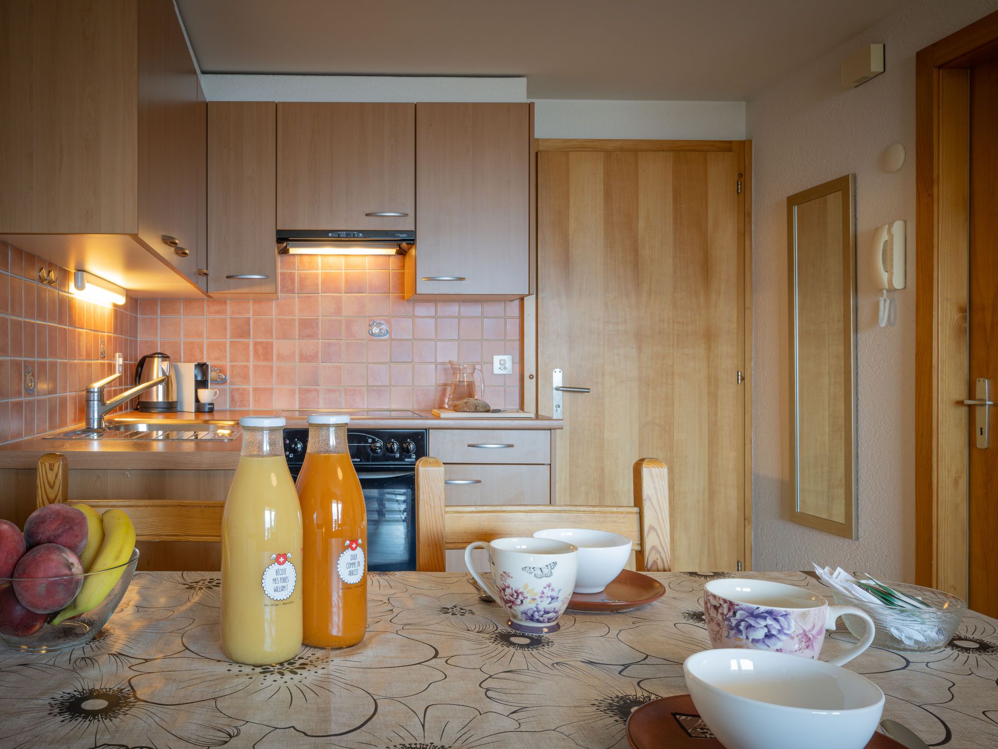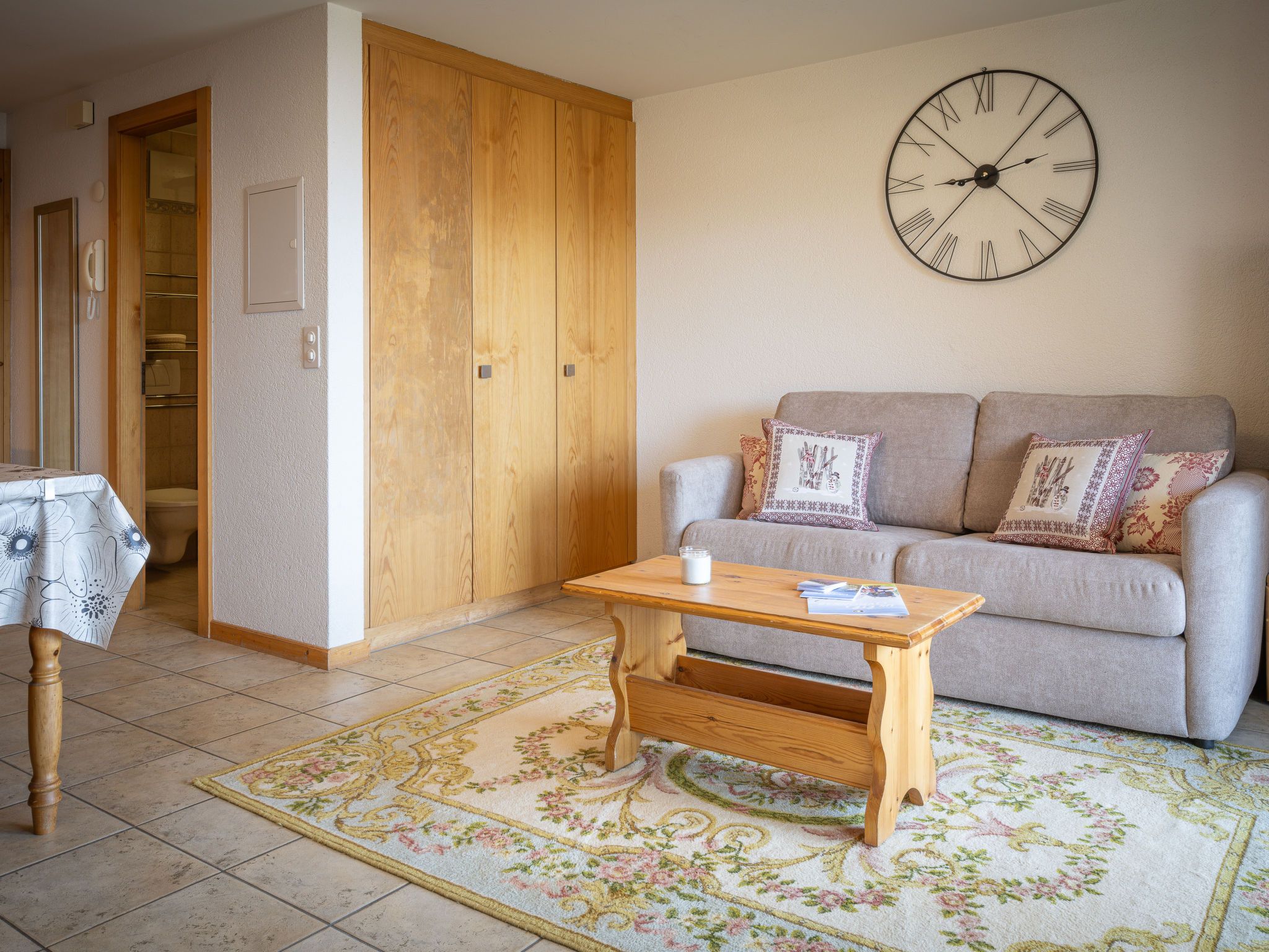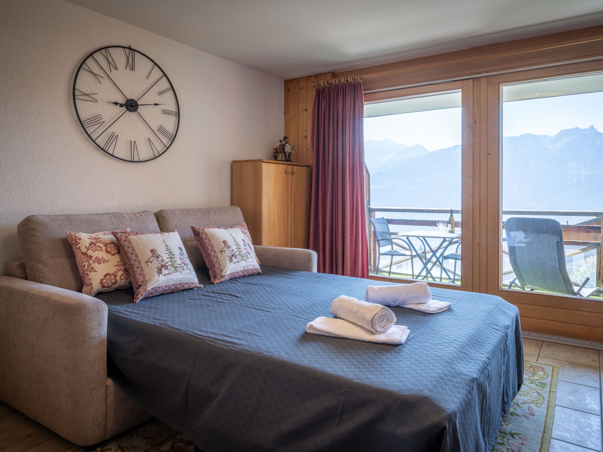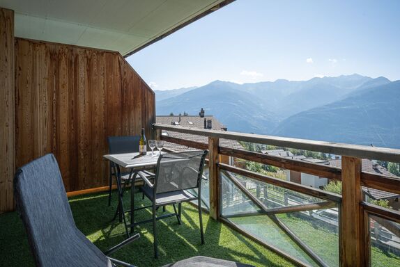 Seya 21, 1-Zimmer-Studio 26 m2 im 2. Stock, Südlage. Geräumig, komfortabel und geschmackvoll eingerichtet: Wohn-/Schlafzimmer mit Panoramafenster mit 1 Diwanbett (150 cm, Länge 190 cm), Essecke, Kabel-TV und Flachbildschirm. Ausgang zum Balkon, Richtung Süden. Offene Küche (Backofen, 4 Glaskeramikplatten, Toaster, Wasserkocher, Mikrowelle, elektrische Kaffeemaschine, Kapseln für die Kaffeemaschine (Nespresso) extra, Racletteofen, Fondue Set (Chinoise, Käse)). Dusche/WC. Balkon 8 m2, Südlage. Balkonmöbel, Elektrogrill (mobil), Liegestühle (2). Sehr schöne Sicht auf die Berge und das Tal. Zur Verfügung: Haartrockner. Internet (Wireless LAN, gratis). Garage Nr. 21 (1 Auto), Höhe 260 cm, Breite 250 cm. Bitte beachten: Nichtraucher-Unterkunft.