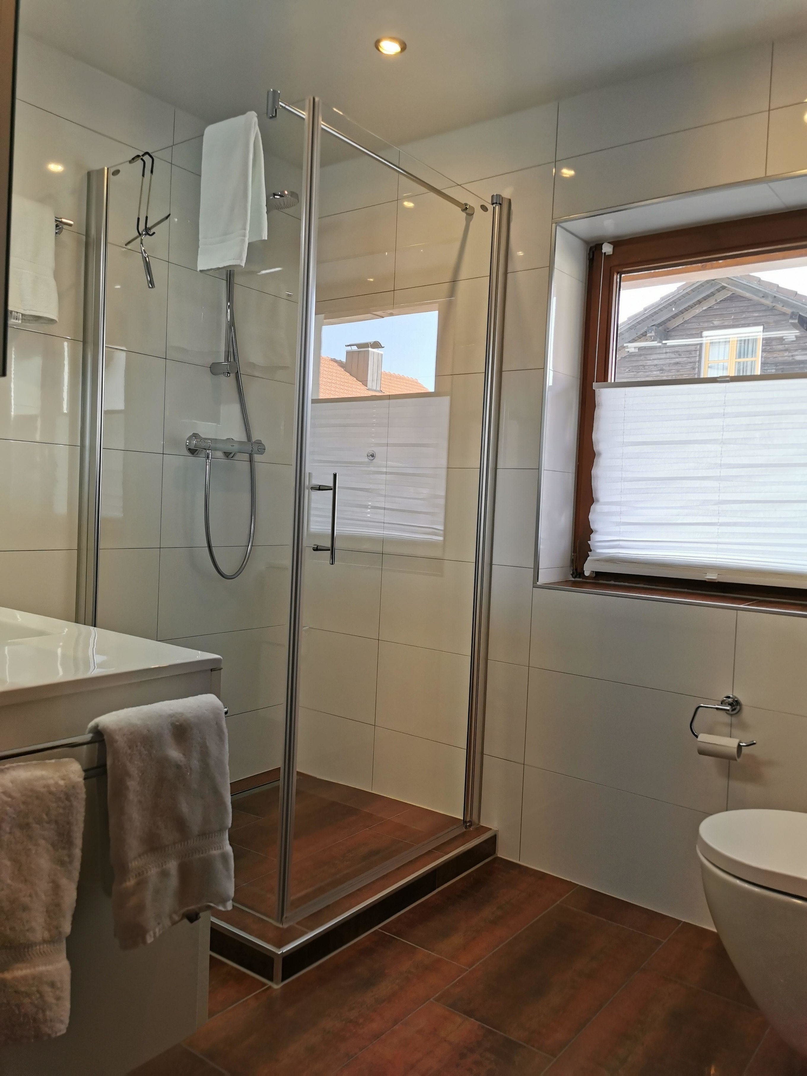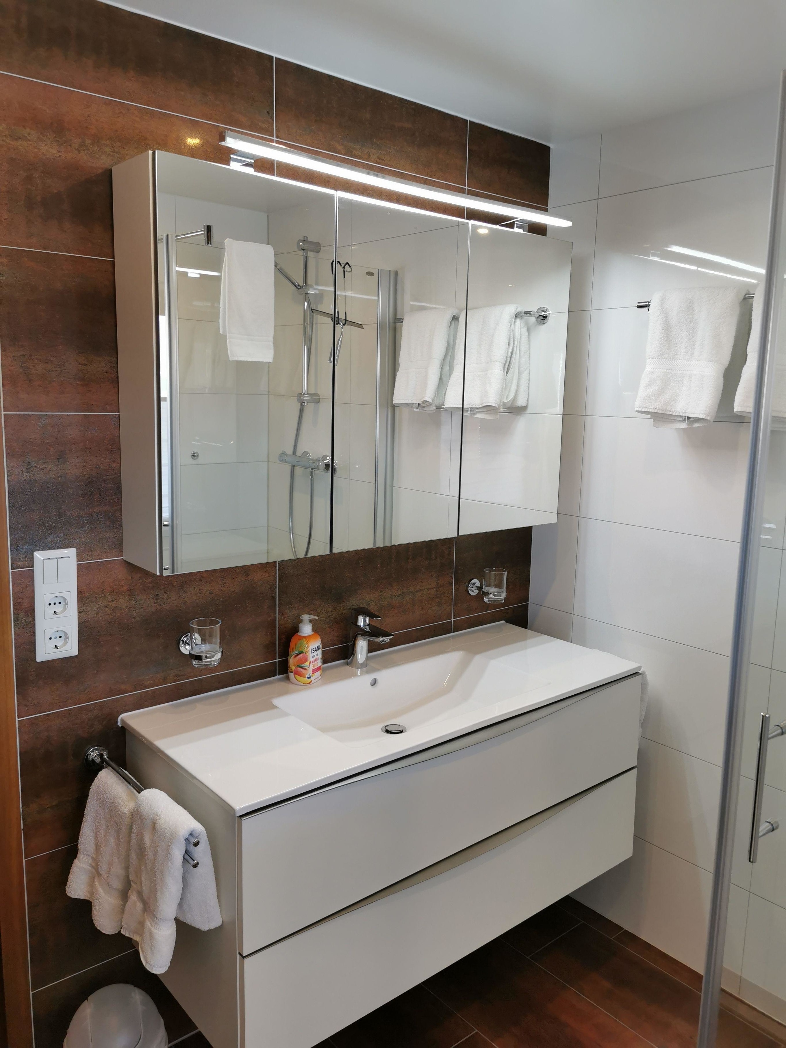 Modernes, renoviertes Tageslichtbad mit großem Spiegelschrank, Waschtisch und Dusche / WC,