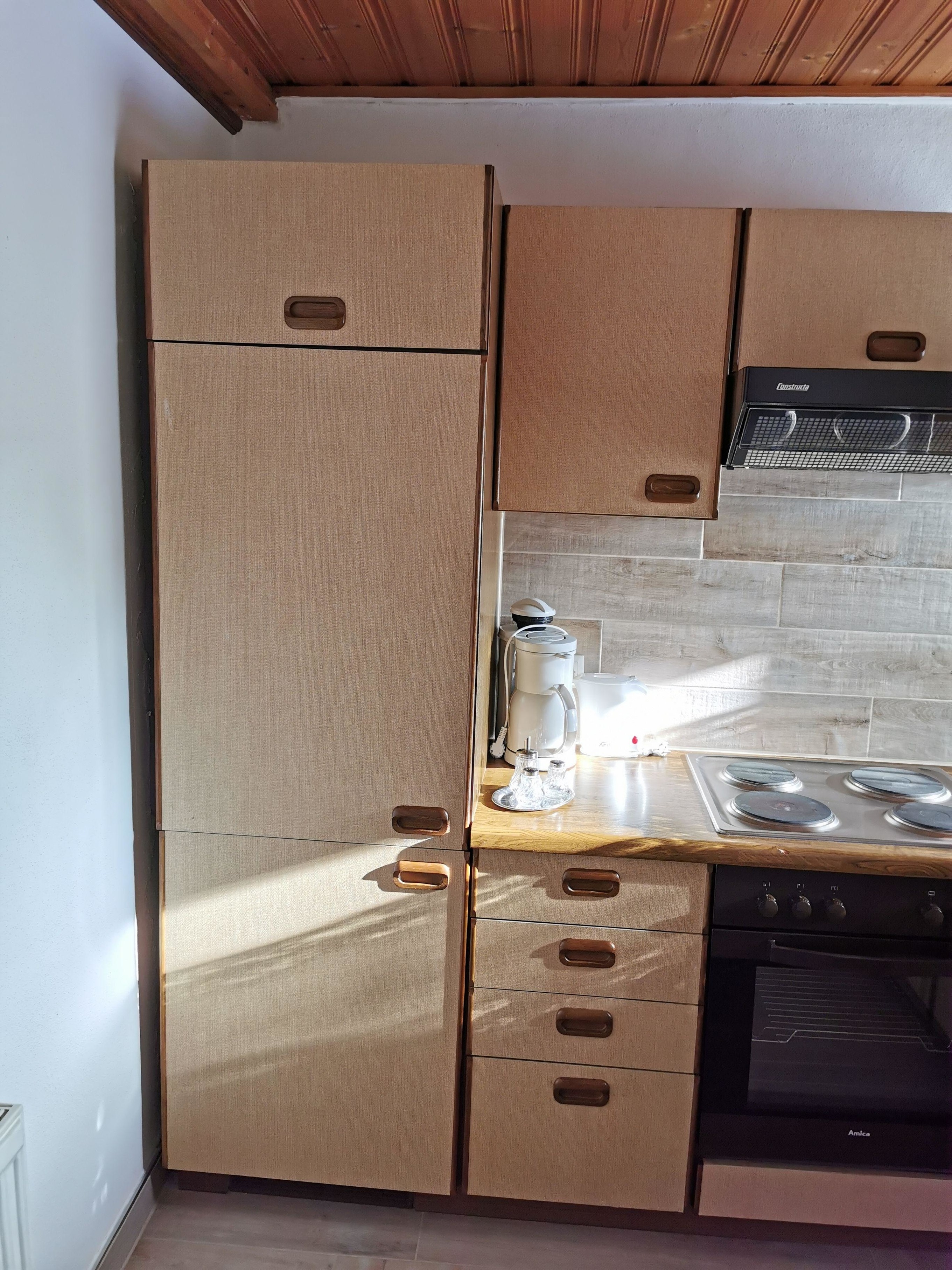 Komplett eingerichtete Küche (Kühlschrank, Gefrierfach, Geschirrspülmaschine, Elektroherd, Wasserkocher),