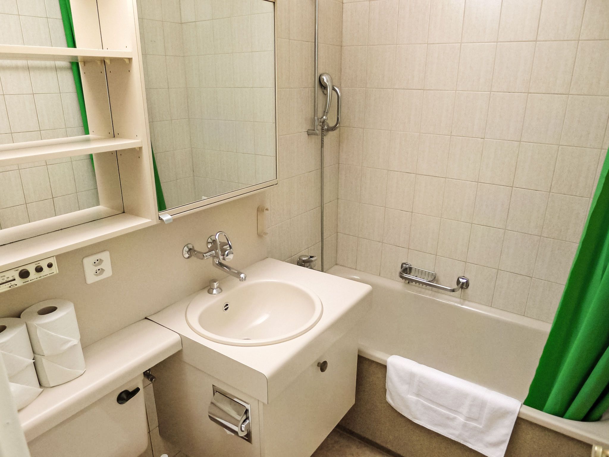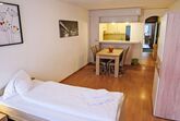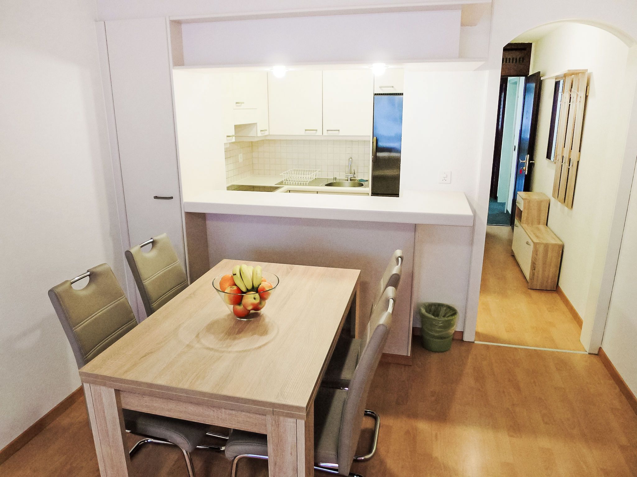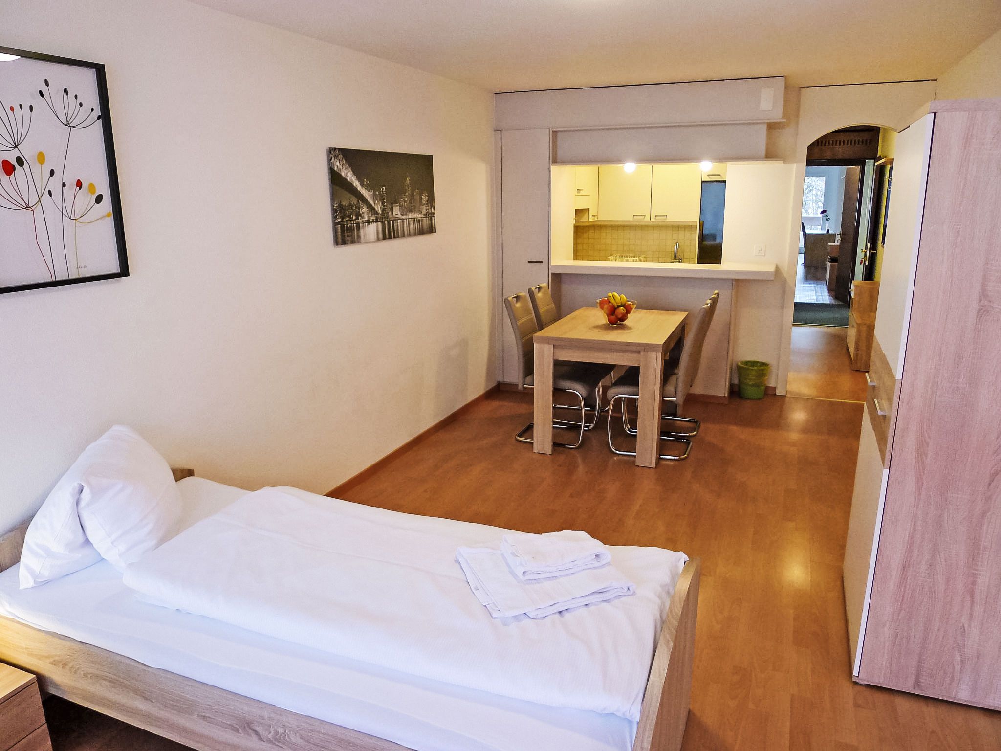 Classic, 2-Zimmer-Wohnung 48 m2. Zweckmässig und gemütlich eingerichtet: Wohn-/Esszimmer mit 1 Bett (90 cm, Länge 200 cm), Kabel-TV (Flachbildschirm). Ausgang zum Balkon. 1 offenes Zimmer mit 2 Betten (90 cm, Länge 200 cm). Offene Küche (4 Kochplatten, Backofen, elektrische Kaffeemaschine, Kapseln für die Kaffeemaschine (Nespresso) extra). Bad/WC. Balkon. Zur Verfügung: Internet (Wireless LAN, gratis). Bitte beachten: Nichtraucher-Unterkunft.