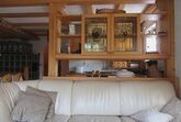Zum Wohnzimmer gehört eine offene Wohnküche mit Eßecke, Couchecke mit Ledercouch, Ledersessel, Couchtisch.